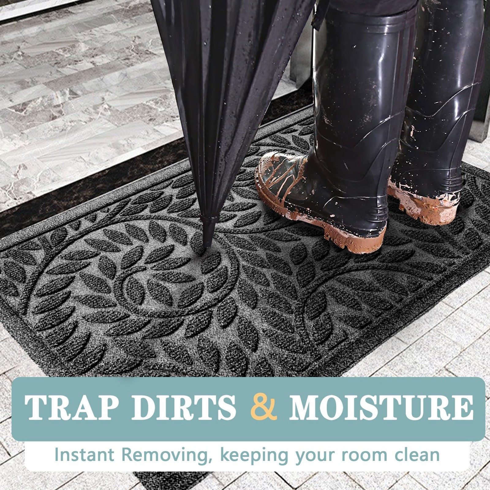 outdoor doormat is a perfect mess solution for your entryway. Heavy-duty rubber backing prevents moisture from leaking and makes sure the doormat stay in place safely.Solid solution for wet, rainy, snowy days. Front door mat designed with beveled rubber border scientifically. Make sure the outdoor doormat is durable and long-lasting without tearing or curling. Super absorbent polypropylene surface of our doormat contains patterned grooves which can effectively scrape mud and absorb moisture from muddy shoes and paws.Well-fabricated polypropylene surface won't fade or shed. 【DURABLE NATURAL RUBBER BACKING】- Designed with a durable natural rubber backing; natural rubber provides higher tensile strength, higher tear resistance, and less odor than synthetic rubber 【EFFICIENT DUST REMOVAL】- The outdoor door mat features polypropylene material with patterned groove design that effectively scrapes rain, grit, mud, sand, grass, slush from shoes, trap them beneath shoe level to prevent tracking. Perfect indoor outdoor door mats to keep your doorway clean and dry 【EASY TO CLEAN】- Simply use a vacuum cleaner, or sweep with a broom, or pat the backing and shake the outdoor mat. For a deeper clean, use a garden hose to rinse the doormat, and fully air dry 【NON-SLIP AND SAFE】- 2.5kg/㎡ rubber backing and A-grade 850g/㎡ polypropylene surface, much thick and heavier than other normal TPE or TPR backing entrance mat. Rolling package rubber entry mat can grip on floor more tightly and flatly without warping corners or crease 【MULTI-PURPOSE & ALL-WEATHER】- Low profile rugs for entryway can be widely used, such as double door mat for front door and back door, garage door, porch rug, shoe mat. This outside door mat can withstand all weather changes and season changes, no matter in rainy, windy, or snowy winter