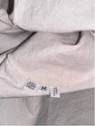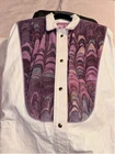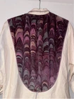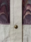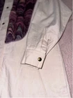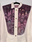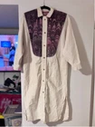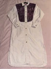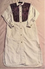 This is a womens duster. He is a size medium. It is 100% cotton. It is made by Suzy Wyoming. It's beautiful. It has a collar. It has a light purple, thick trim around the collar. The front and back chest area are purple velvet panels, adored Med with purple rhinestones. The code has long sleeves and snaps at the cuff. It has snaps all the way down the front. It is completed. Looks like it came out of a western. It does need to be cleaned.  it's beautiful other than some white dirt. I don't think there's a thing wrong with it. It feels like canvas. But it is cotton.