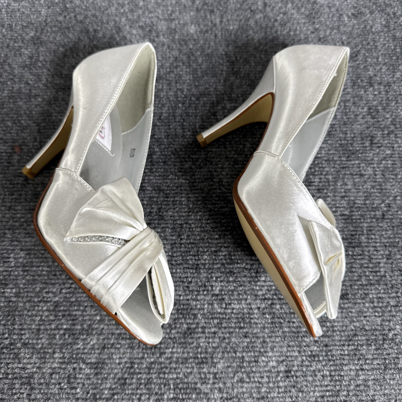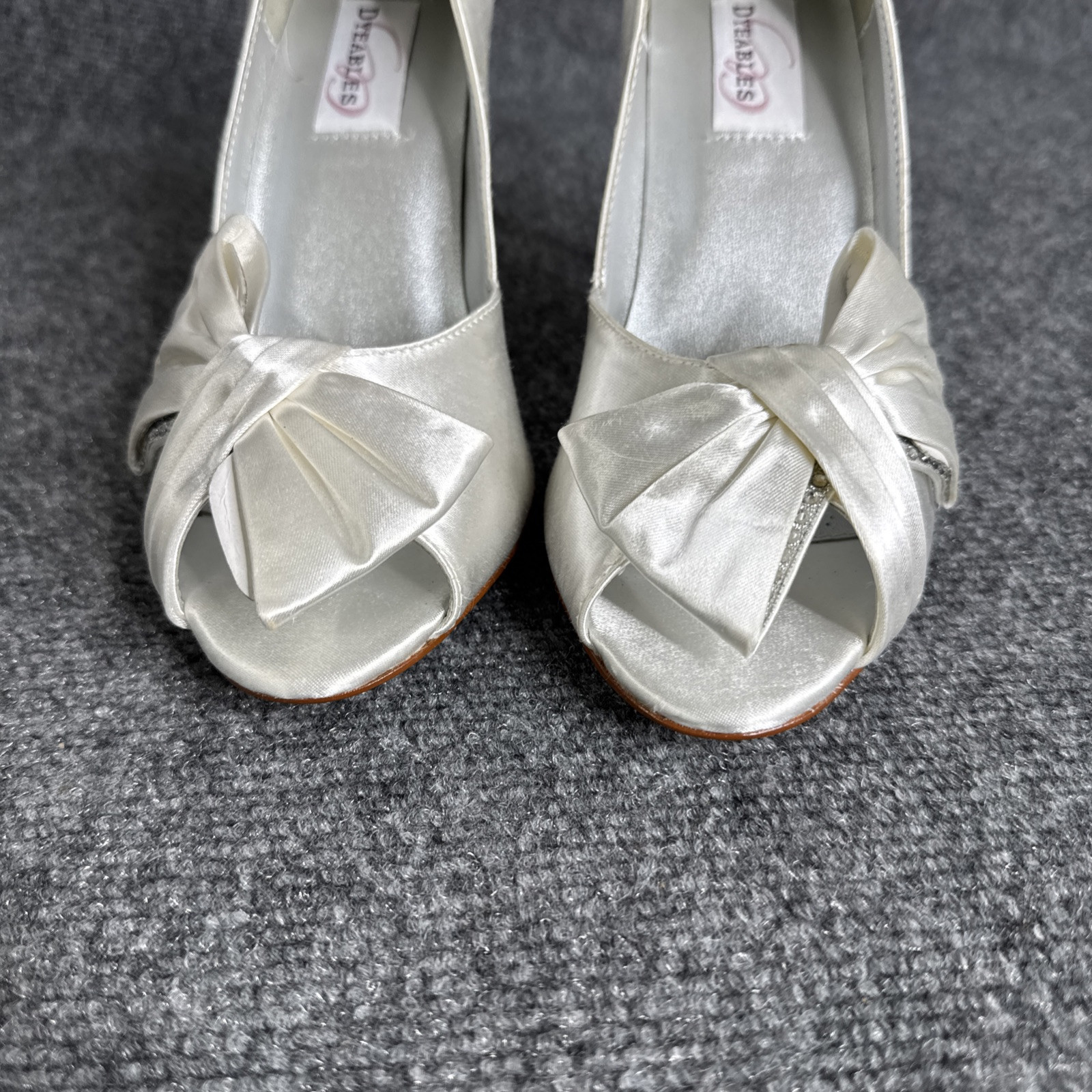 Sku# 10962 Dyeables Women's Liv Open-Toe Pump, White Satin Size 8.5 B High Heels Please refer to Photos for Flaws if any stated This item is Preowned Very Good Condition, U S A Seller Fast Shipping Combined Shipping Available 100% authenticity guaranteed Our items are all carefully examined, measured, photographed and stored in a smoke free environment. All items cleaned per eBay standards.