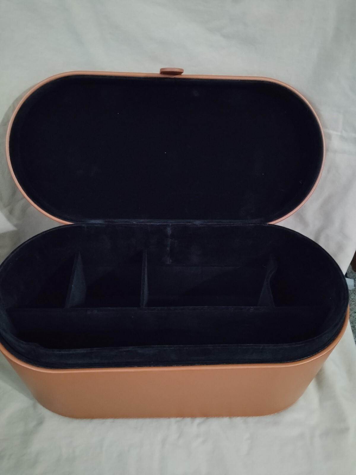 THIS IS A DYSON AIR WRAP STORAGE CASE IT IS LEATHER AND IN EXCELLENT CONDITION IT IS 14 INCHES LONG 7 INCHES WIDE 6 INCHES TALL MARKED DYSON ON THE TOP