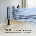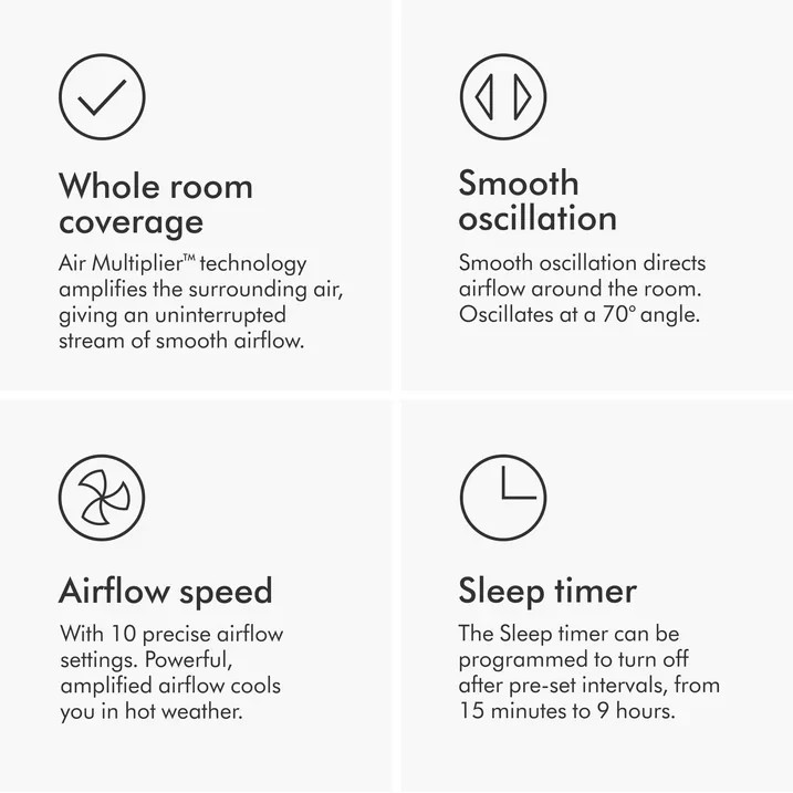 stream of smooth airflow With 10 precise airflow settings. Powerful, amplified airflow cools you in hot weather. The Remote control is curved and magnetized to store neatly on your Dyson Cool™ Tower Fan The Sleep timer can be programmed to turn off after pre-set intervals, from 15 minutes to 9 hours Smooth oscillation directs airflow around the room. Oscillates at a 70 ° angle No fast-spinning blades. Brand Dyson Electric Household Fan Type Tower Fan Housing Material Plastic Assembled Product Weight 6.26 lb Recommended Location Indoor Power Type Corded Electric Cord Length 79.2 in Number of Blades 0 Number of Speeds 10 Mount Type Free Standing Volts 120 V Features Remote Controlled Manufacturer Dyson Manufacturer Part Number 464802-01 Model AM07 Assembled Product Dimensions (L x W x H) 4.40 x 7.50 x 39.60 in