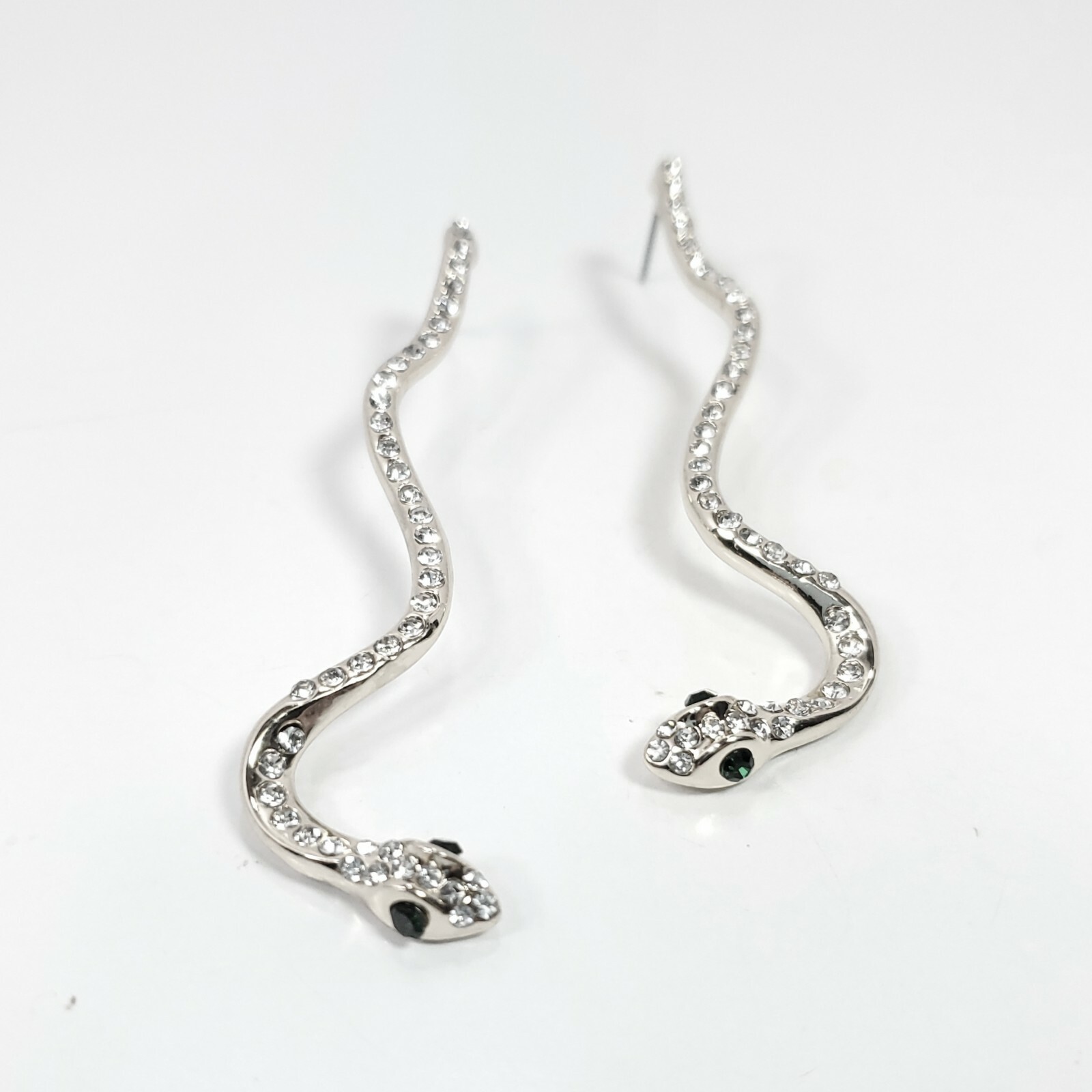 E0717 Silver Tone Clear Rhinestones Deco Animal Snake Design Long Drop Earrings