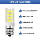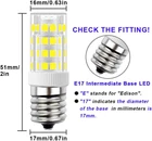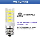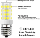 ★ Get the right LED bulb for your appliance! (1) Dimension: 0.63” x 2” (Dia*L). (2) Not Dimmable. (3) Make sure the original halogen bulb for your appliance is E17 base. Refer to Product Image 3 & 4. ★ ENERGY SAVING- 4W E17 LED bulb is equivalent to 40W E17 halogen bulb. 400 lumen of light output. Save 90% on your electricity bill. ★ EXCELLENT HEAT DISSIPATION -E17 appliance bulb with good heat dissipation is cool to touch. So it has long lifespan. Save effort and costs on changing bulbs frequently. ★ NICE LIGHT- CRI> 80 daylight white 6000k E17 light bulbs give off nice and bright light, good for you to see what you're cooking. ★ WIDE APPLICATIONS- Not Dimmable E17 led appliance bulbs fit for stovetop, over the counter microwave ovens appliance, desk lamp, ceiling fan light fixture, freezer etc. Product Description Features: E17 LED bulb is as bright as 40w e17 light bulb, but only consumes 10% energy. Save 90% on electricity bill of lighting. E17 appliance light bulb led gives off bright daylight white light, good for you to see what you're cooking. Long lifespan, no need to change bulbs frequently. Save efforts and costs. Easy to install. Instant-on to full brightness. Specifications Base: E17 Base Power: 4W (40W halogen bulb equivalent) Dimmable: Not Dimmable Size: 0.63" x 2" (Dia*L) Luminous Flux: 400 Lumen Color: 6000k Daylight White Applications Fit for over the counter microwave oven, kitchen appliances, over the counter range hood, stove-top light, refrigerator lights,etc. Get the Right LED Bulb for Your Appliance! Please do not install this E17 LED inside microwave oven . E17 LED bulb is NOT DIMMABLE . Please do not use it on low setting, or it will flicker.