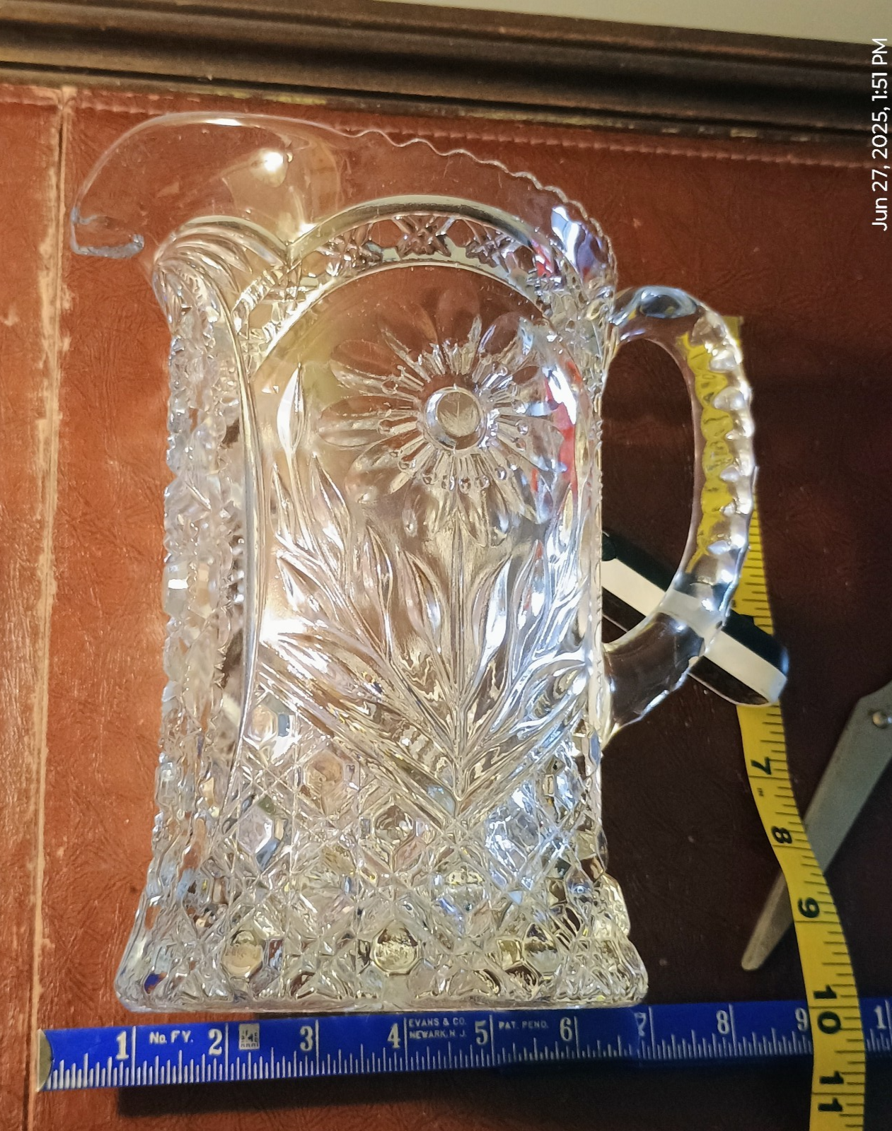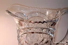 This American Brilliant period pressed glass water pitcher weighs over 5-pounds. Its seam(s) can be seen and felt. Its starburst-patterned bottom bears a logo which looks like "LGI," which would not lend itself to a good photo. This multi-tasker not only keeps iced water cold, but also reflects light beautifully and also serves as a vase for your table.