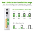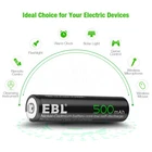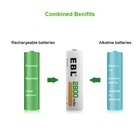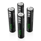 Features For AA & AAA Ni-MH Rechargeable Batteries: Features 1. EBL Branded ,Pro-environment. 2. NO memory effect NIMH chemistry. 3. Recharged up to 1000 times. 4. Relatively long service life. 5. 100% New and high quality. 6. Superior performance under low temperature condition. The Details 1. Battery Voltage: 1.2V 2. Capacity: (800mAh AAA)/(1100mAh AAA )/(2300mAh AA )/(2800mAh AA) 3. Battery Size: AAA/AA 4. Rechargeable type: Ni-MH/ NIMH High capacity NO memory 5. Storage Case : Yes (for 4PCS Battery/per case) 6. Brand: EBL 7. Model: R03/ R06 8. Case : included(4pcs battery /case) For 500mAh AAA 1000mah AA Ni-CD Rechargeable Batteries: 1. Battery Type: AAA/ AA 2. Capacity: 400mAh/1000mAh 3. Voltage: 1.2V 4. Chemistry: Ni-CD 5. Weight: 7.8 ounce (220 g) 6. Pro-environment, 7. EBL batteries can be recharged up to 1200 times when fully or partially drained. 8. Batteries are great for use in household devices such as digital cameras, toys, remote controls, hand held games Compatible with Flash Light,LED Torch ,Camera, Remote control, Garden solar light, ,Detector ,toys etc , multifunction battery Package 4~20pcs AA / AAA Rechargeable Batteries (see dropdown menu droplist) with Clear Storage Box( 4pcs batteries /Case)