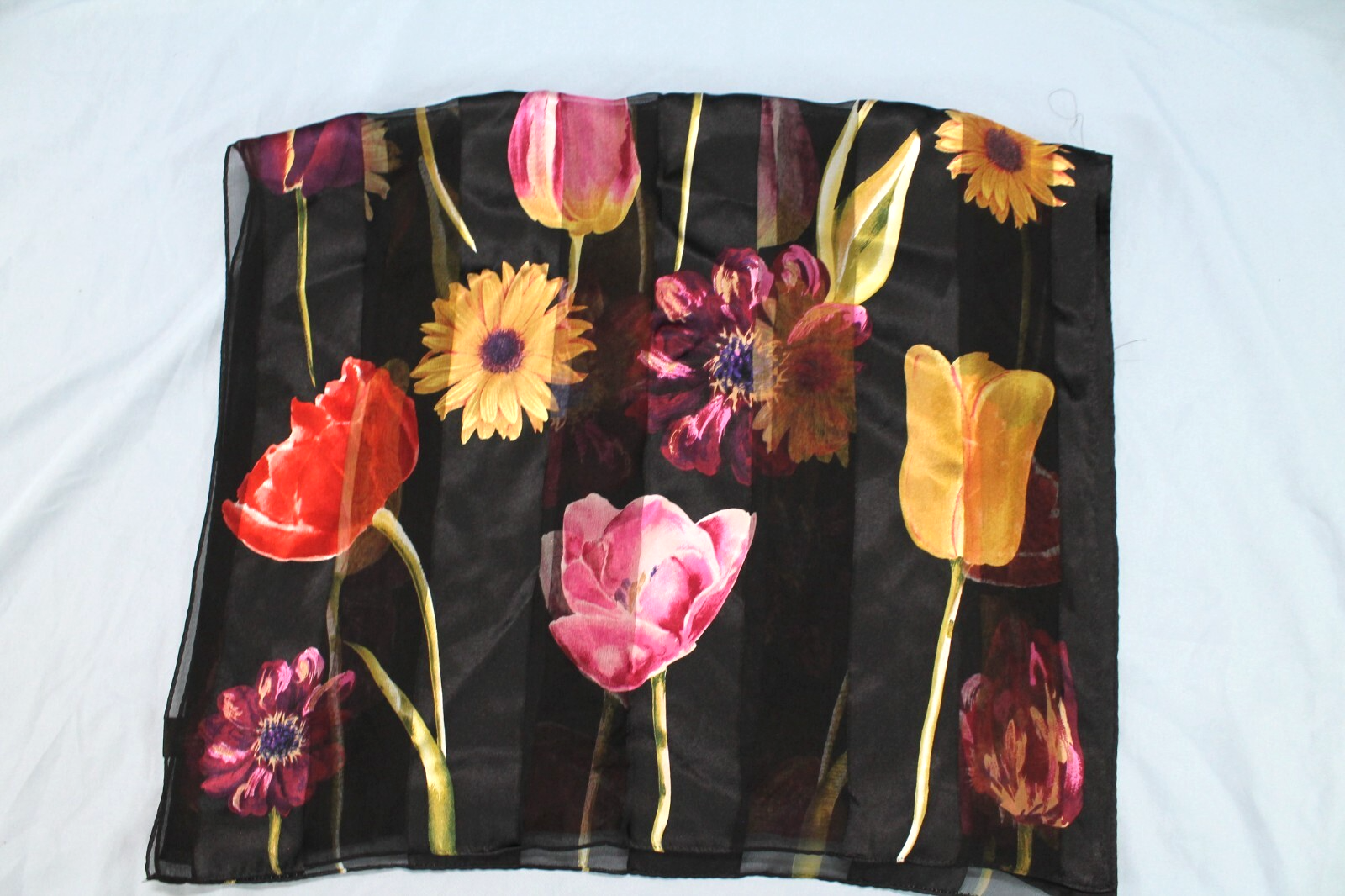 This stunning silk scarf is a perfect blend of elegance and versatility! The semi-sheer design with delicate stripes and floral accents adds a touch of sophistication to any outfit. Lightweight and soft, it drapes beautifully—ideal for both casual and dressy looks. The generous size makes it easy to style in multiple ways, and the gently used condition is flawless. A must-have accessory that feels luxurious and looks effortlessly chic!