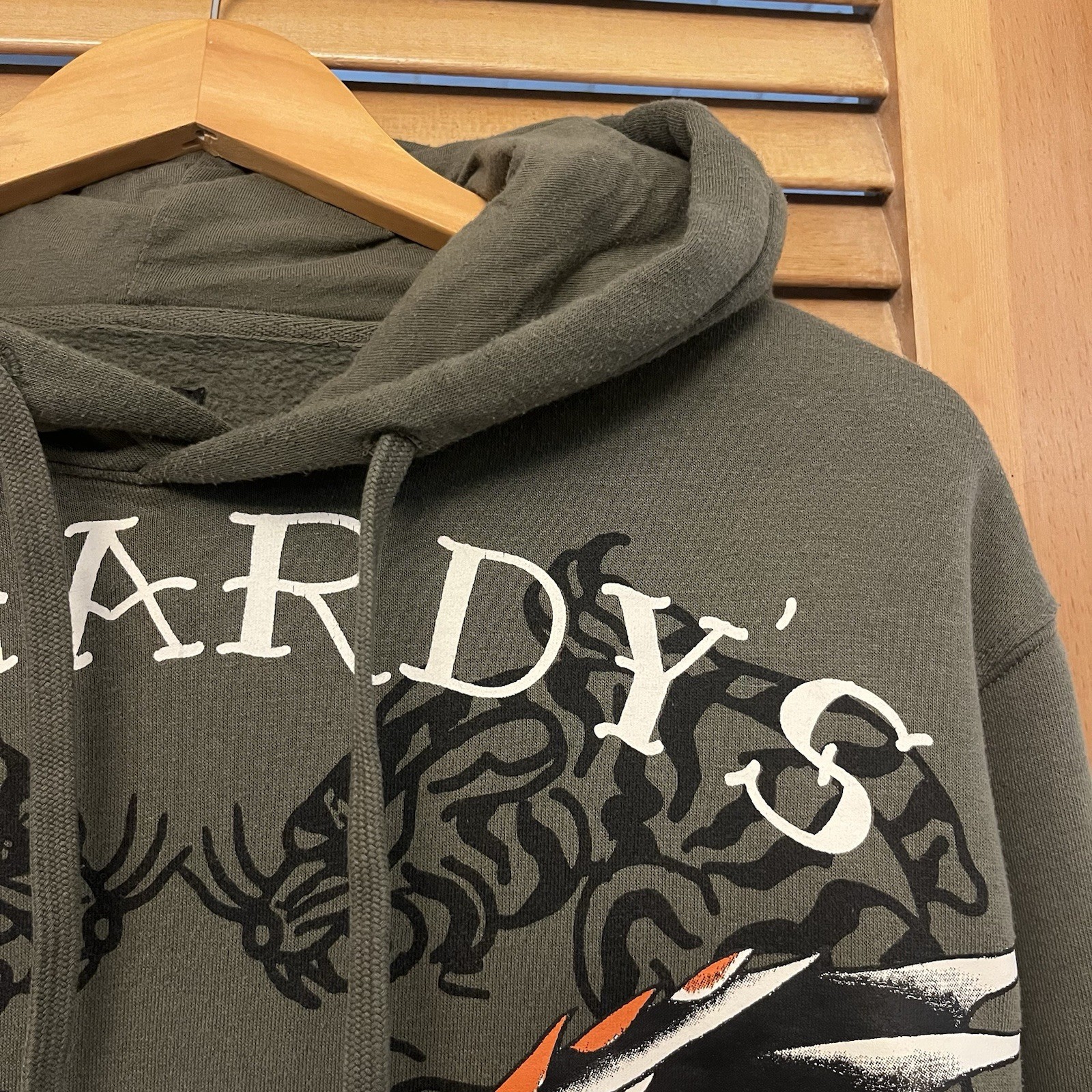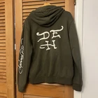 The product is a men's Ed Hardy hoodie sweatshirt in hunter green, size M. This hoodie is designed for regular fit and features a stylish tattooing design typical of the Ed Hardy brand. It is a comfortable and stylish activewear piece for men, perfect for casual wear. The green color adds a trendy and unique touch to the overall look. Like new.