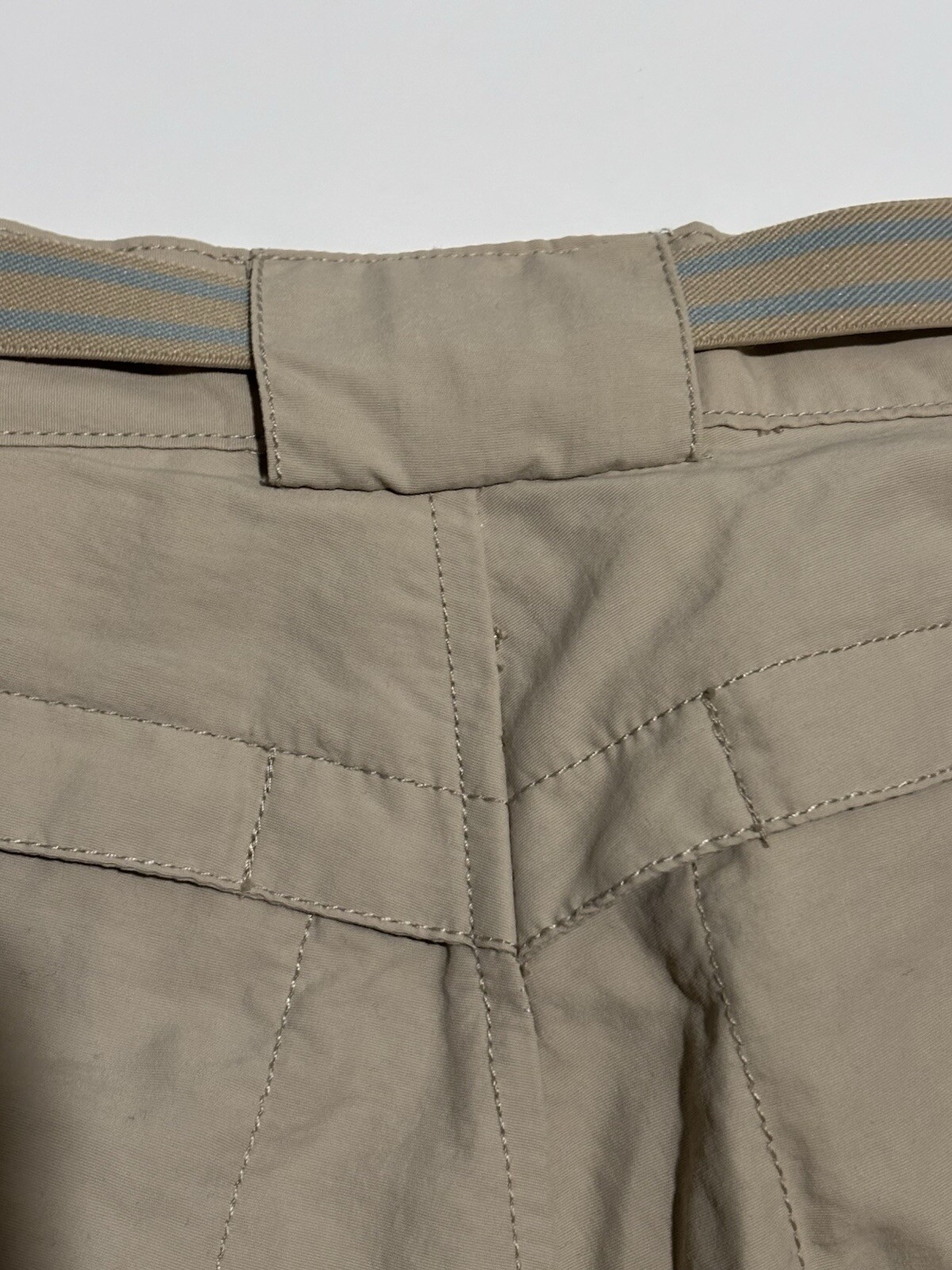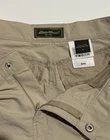 These Eddie Bauer women's size 6 outdoor hiking performance cargo pants are made of lightweight nylon with adjustable features like the waist and ankles. They feature mesh pockets, a colorful belt, and a zipper closure. Ideal for travel, casual wear, or workwear, these beige pants have a straight leg design and a flat front. Perfect for outdoor activities in various seasons.