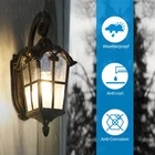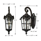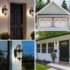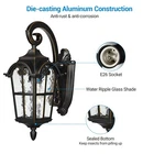DEWENWILS Outdoor Wall Light Fixtures Wall Mount, Black Roman 17.7" H Exterior Wall Lantern, Anti-Rust & Waterproof, Water Ripple Glass, Outside Wall Sconce Porch Light for House, Garage Retro Design Matte Black finish with golden edge, adds a retro and gorgeous look on your house, as well as brightening your way at night. Easy Installation Hardwired design, all necessary hardware is included for direct installation. Sealed bottom design for preventing water and insects from pilling up. Weaterproof & Anti-rust Thick die-casting aluminum frame ensures stability. Weather resistant, will never get rusty or corrosive after years of use. About this item [Vintage & Water Ripple Glass] Matte black finish with glitzy gold edges endows the 17.7" exterior light fixture a elegant and vintage look; the hammered moire glass shade is easy to clean and stylish, and the light reflects wonderful patterns on the wall, gorgeous lighting effects [Durable Aluminum & Weatherproof] The outdoor light fixture is made of die-cast aluminum and high-tech coating, anti-rust, and anti-corrosion, and can be used for many years; IP65 weather-resistant, no matter in rainy, snowy, windy, or sunny days; sealed design keeps out moisture or bugs [E26 Socket] Compatible with various E26 bulbs up to 60 watts(sold separately), including LED, CFL, incandescent, or halogen bulbs; with water ripple glass shade, the outdoor wall light creates a truly unique look by adding a vintage Edison bulb; 1-year warranty provided [Hassle-free Installation] The glass is pre-assembled, hardwired design, all mounting accessories are included for easy and quick installation; sealed bottom for keeping insects from pilling up; for better performance, please install this outdoor wall lantern at least 6ft from the ground [Wide Application] Comes with all necessary accessories for easy installation; you can mount the porch light fixture in your patio, garden, balcony, front door, and doorway, not only brightening your hallways, but also adding vitality to your house Dimensions - Total Height: 17.7'' - Front to Back- 10.2'' - Backplate: 10.6'' x 4.1‘’ (H x W)
