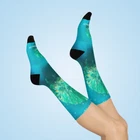 These cushioned DTG crew socks are a one-size style designed with both function and appearance in mind. With the fully cushioned heel-to-toe, these socks provide superior comfort, while the DTG print process allows for ultra-crisp, crease-free printing. Composed of 73% polyester, 18% nylon, 6% spandex, and 3% cotton, these socks are an elevated alternative to the typical sublimation sock and provide a clean, comfortable base for your all-over print designs. .: Material: 73% polyester, 18% nylon, 3% cotton, 6% spandex .: One size: comfortably fits women's size 5 US up to men's size 12 US .: 200 needle knit premium socks .: Cushioned bottoms
