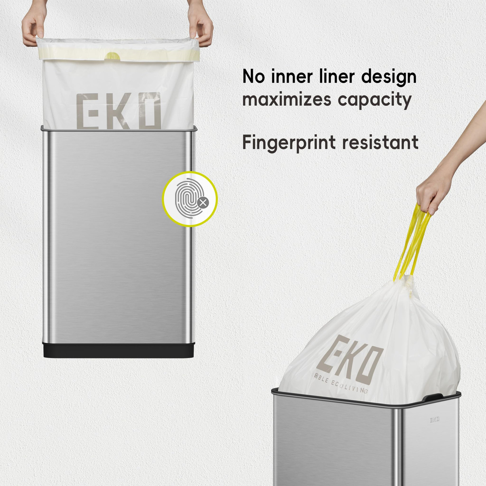 Premium Motion Sensor Technology - Experience the smoothest, most seamless lid opening and closing technology with this EKO hands-free automatic trash can. Ultimate Fingerprint Resistance - Say goodbye to smudges and hello to a clean flawless exterior that stays immaculate. The anti-fingerprint stainless steel finish keeps your space clean and stylish. Space-Saving Vertical Design - Save space with a vertical layout, and the dual-wing lid needs less room overhead when opening. 25% More Capacity - No liner design maximizes capacity by offering 25% more room to dispose of the trash. Long-lasting Power - Use with AA alkaline batteries and can last up to 8 months of use, making our kitchen garbage can eco-friendly and your wallet happy.
