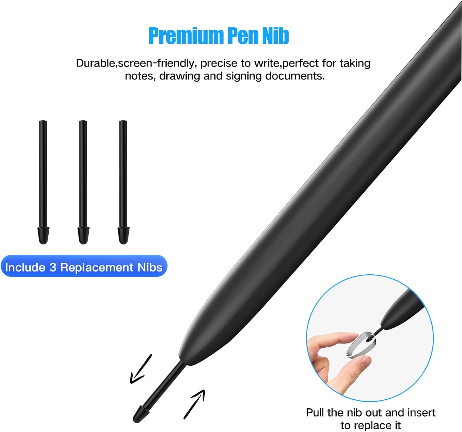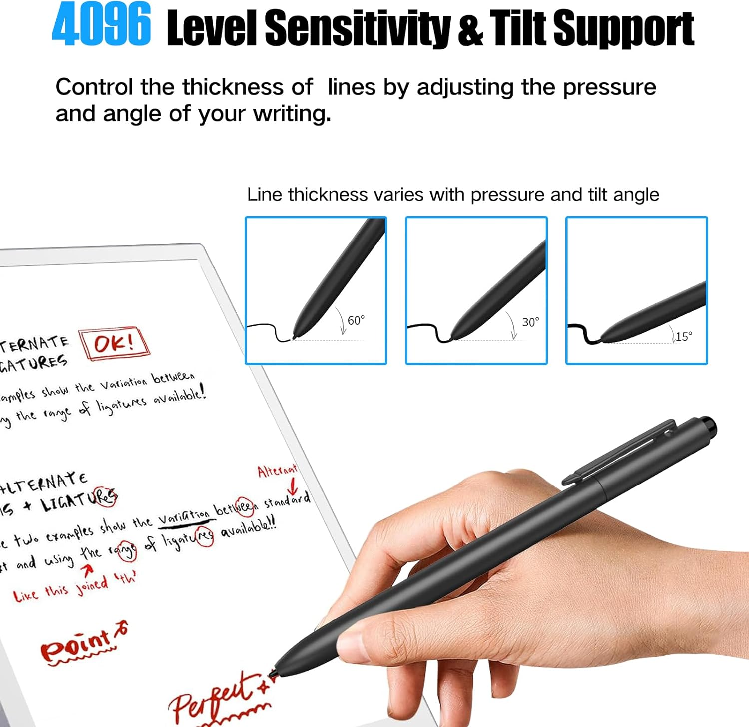 🌐【Wide Compatibility】: Our stylus for EMR is designed to be compatible with a wide range of EMR devices and tablets, including Remarkable 2/Samsung tablets. Not compatible with Apple (iOS), Android, Remarkable Paper Pro, Remarkable Pro, or Windows systems. (Please check the image list before purchasing.) 🧹【Eraser Function&4096 Pressure Sensitivity】: The end of the stylus adds the convenience of an eraser, making it convenient for you to easily erase the lines and letters simply by flipping the pen upside down. Natural Writing Experience: Enjoy the feel of pen on paper with our Stylus Pen's 4096 pressure sensitivity levels. Whether you're taking notes, sketching, or navigating, the EMR Pen delivers precise control for a natural writing experience. 🔋【EMR Support&Ergonomic Design】:Say goodbye to the hassle of charging for emr stylus with eraser. The EMR stylus pen operates through electromagnetic induction technology. It can work right out of the box. There is no need for switching, charging, bluetooth pairing and other complicated setup procedures. You can simply pick up the pen and use it wherever and whenever you want. The EMR stylus pen's body surface is light and comfortable and provides a very natural writing experience with perfect ergonomics. 🖐️【Tilt Sensor & Palm Rejection】: With tilt sensor, the digital pen works perfectly at any angle you tilt it, making it easier for you to tackle more complex drawing tasks.The enhanced EMR technology recognizes only the tip of the pen and ignores the palm. Your hand can rest at any position on the screen without affecting your writing, helping you find the most comfortable writing posture. ✍️【Replacement Nibs&Pencil Holder】: 3 replaceable nibs are made of high-quality ABS and PC material, which are not only du-rable but also screen-friendly. Comes with a pencil holder,Strong adhesive keeps the pencil holder securely in place,holds your pen more securely, allowing you to grab or store the pen quickly and easily.Package Included: 1 x EMR Stylus, 3 x Replacement Nibs, 1 x Pencil Holder,1 x Pen Clip. Product description 1 Package Included 2 Eraser Function 3 Elegant design