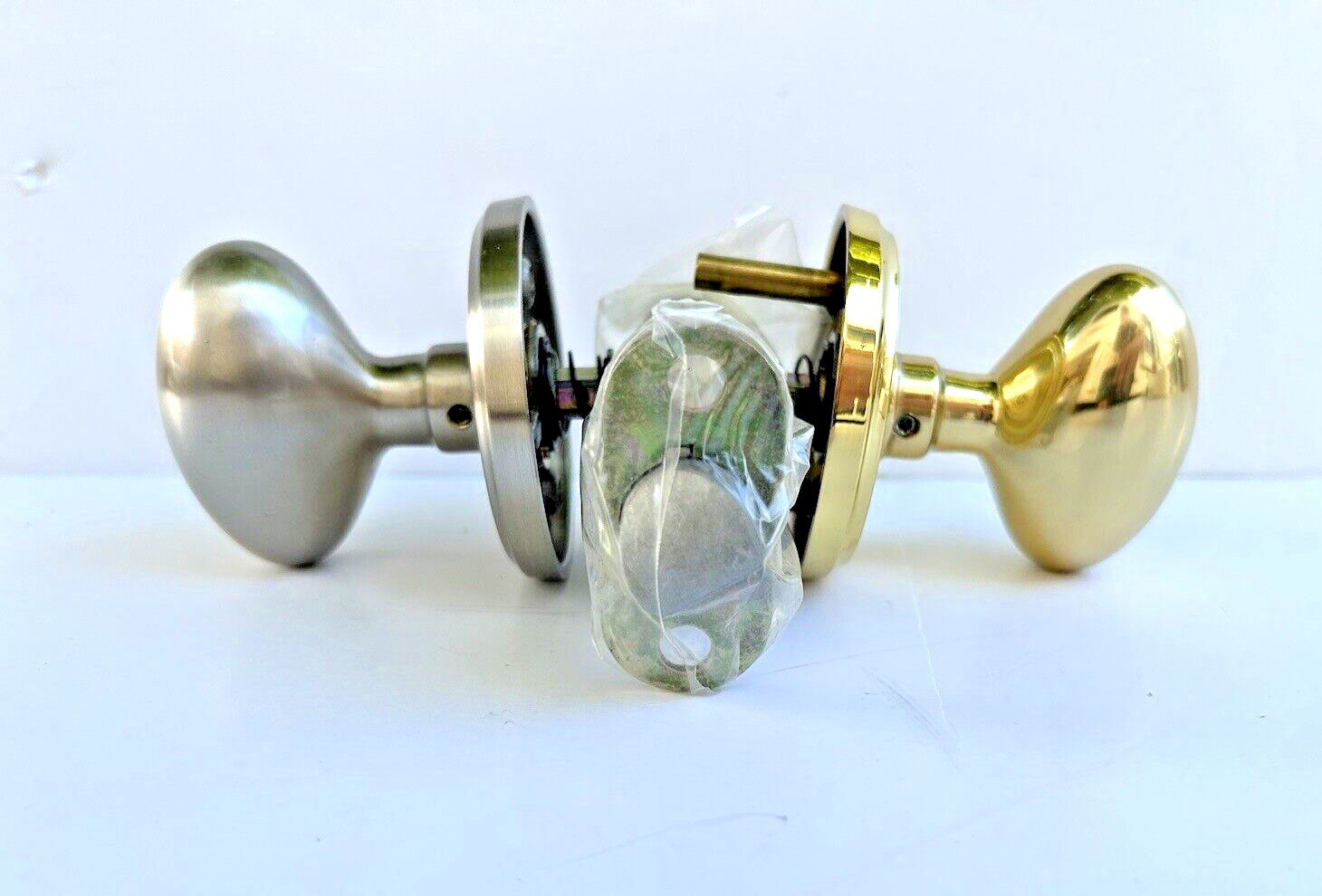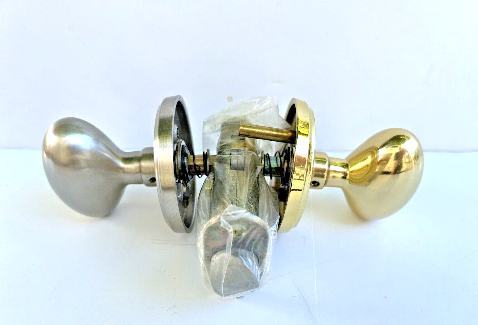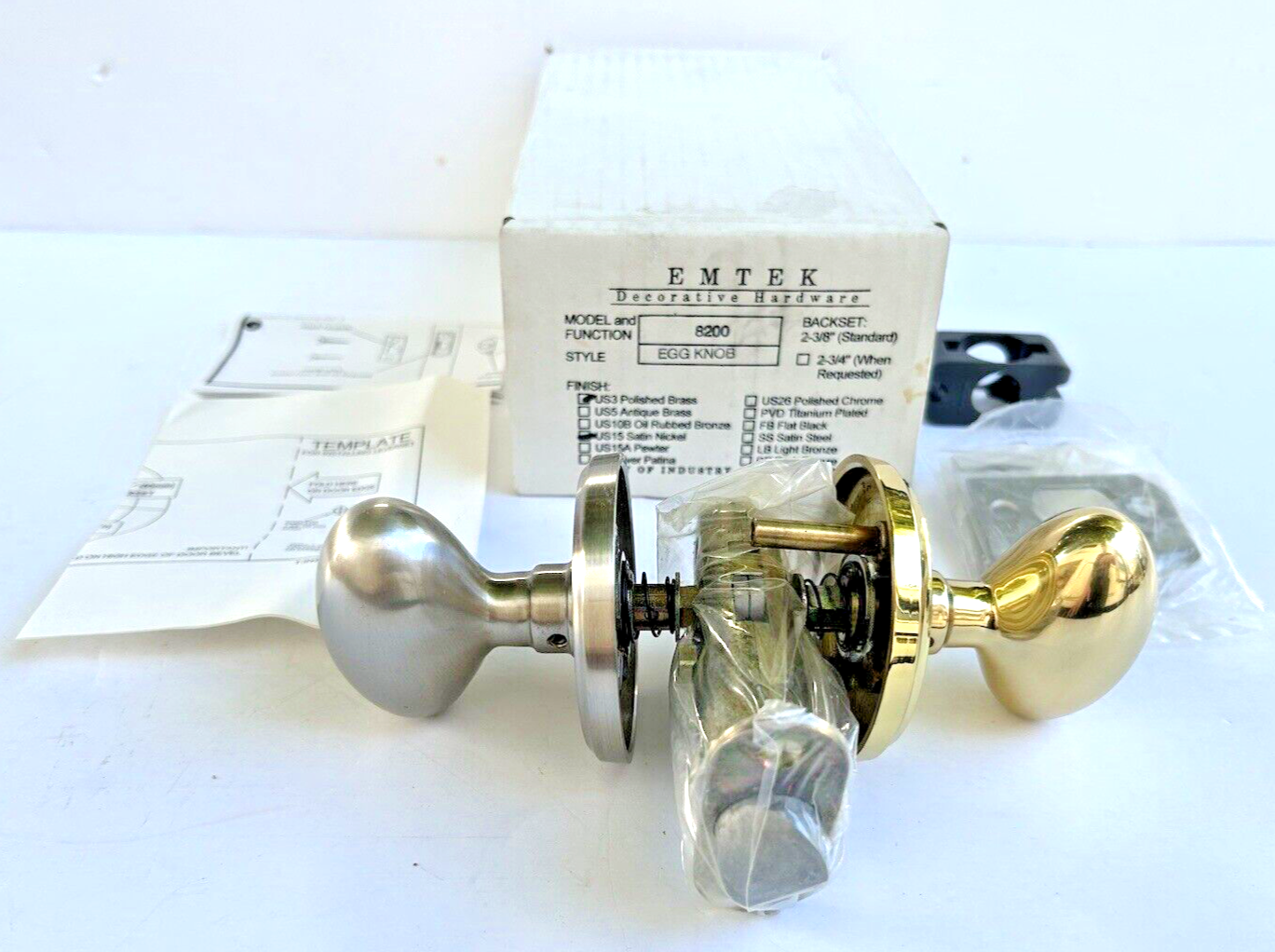 Emtek 8200 Egg Privacy Knob Set, one knob is Polished Bronze and the other knob is Satin Nickel. This listing is for ONE of the Above Pictured EMTEK 8200 Egg Privacy Door Knob Set, US15 Satin Nickel & US3 Polished Bronze PART NUMBER- EMTEK 8200 Discount Price - WE ARE NOT DEALERS OR LOCKSMITHS SO PLEASE LOOK AT ALL THE PICTURES TO SEE EXACTLY WHAT YOU WILL RECEIVE. We are extremely selective and particular with who we will buy from so we can have confidence in the quality of anything we send out even though we are not experts.You will get exactly what you see pictured, there will be no stock or copied photos. Unfortunately, we don’t know if it has everything you need however if you’ve already done your research or know what you’re looking for, we can surely save you some money. The majority of our items are new unopened boxes however, some definitely have been opened so Please confirm they have all of the pieces you need! We may be on the lower end price wise versus the identical item on other sites however PLEASE do not let the price be a reflection of it’s condition , this is NOS directly from the shelves of a very trusted locksmith. We purchased their entire inventory so did not have to buy this directly from the manufacturer and can pass those savings onto you if you already know the exact part # you need. If that’s the case, we can assure you that we will deliver a very good, clean item, described to the best of our ability at a very fair price. The exact item pictured above will be packaged securely and mailed immediately. Our downside is we only have a limited quantity at this or any price so grab what you can while we still have it to save money. Thank you for looking and we look forward to earning your trust and confidence, have a great day! WE ARE NOT DEALERS, WE ARE RE-SELLERS SO CONFIRM YOUR PART NUMBERS PLEASE CONFIRM THIS IS THE PART NUMBER AND SIZE YOU NEED. LOOK AT THE PICTURES CLOSELY AND ASK IF YOU NEED ADDITIONAL MEASUREMENTS TO CONFIRM THIS IS EXACTLY WHAT YOU NEED. ITEMS RETURNED OPENED OR USED WILL BE SUBJECT TO A REFUND DEDUCTION AS DESCRIBED BELOW THAT WE UNFORTUNATELY HAVE TO CHARGE ON RETURNS AND HOPE YOU UNDERSTAND. This is a genuine NOS ( New Old Stock ) part from the stock of a Hardware store closing after 50+ years due to illness. We were fortunate enough to obtain thousands of NOS parts and hope you find what you need. As NOS this part may show signs of age with shelf wear, may not have the original packaging and some have minor surface rust and can be dirty from sitting however has never been used and is sold As Is. Please look closely at the pictures for an accurate description of it's condition as that is the exact item you will receive. Again, we are not dealers and recommend having a licensed Locksmith or Contractor install and help. Full disclosure, we are not contractors, locksmiths or dealers so we will not know what models an item will fit however can try and answer any questions the pictures don't make clear and will provide as much information as we can. It is your responsibility to ensure this is correct part number that you need . Items returned opened or used are subject to at least a 20% refund deduction . We've been able to keep our prices low because you have all been great with double checking your part numbers so let's please keep working together. We are a small family business not a big box store that can afford people buying to try and return. We value the opportunity to help people get what they need and would really appreciate you confirming this is the exact part you need before ordering. Thank You very much! *** CURRENTLY IN STOCK IN THE USA, READY TO SHIP USUALLY THE SAME DAY *** We are a small family business that is fully staffed with no supply chain problems or container ship issues. We usually pack and ship the same day using PRIORITY mail, no economy shipping. We are NOT Locksmiths so Check All information or ask before ordering PLEASE. !! PARTS USUALLY SHIP THE SAME BUSINESS DAY FREE !! Message us for a DISCOUNT on multiples or bundling of parts. We have many parts not listed yet, so please send us a part number and we will make a listing for you if we have it . * FREE SHIPPING TO THE LOWER 48 STATES ONLY * We want to be as transparent as possible so you end up happy and come back again so please ask questions and we will do our best to answer. We take a lot of pride in every step of this process and want to earn your trust and confidence! All items are kept in a smoke and pet free environment. Please look at the pictures so you have no surprises. They are an important component in giving you a clear description of what you will be getting. Thank You for your consideration! Please look in our store for many more parts and items. Don't forget to follow us and visit again soon. If there are any issues please contact us prior to leaving feedback as we would like the opportunity to help and learn what we could do better going forward. Tr2-SHTS