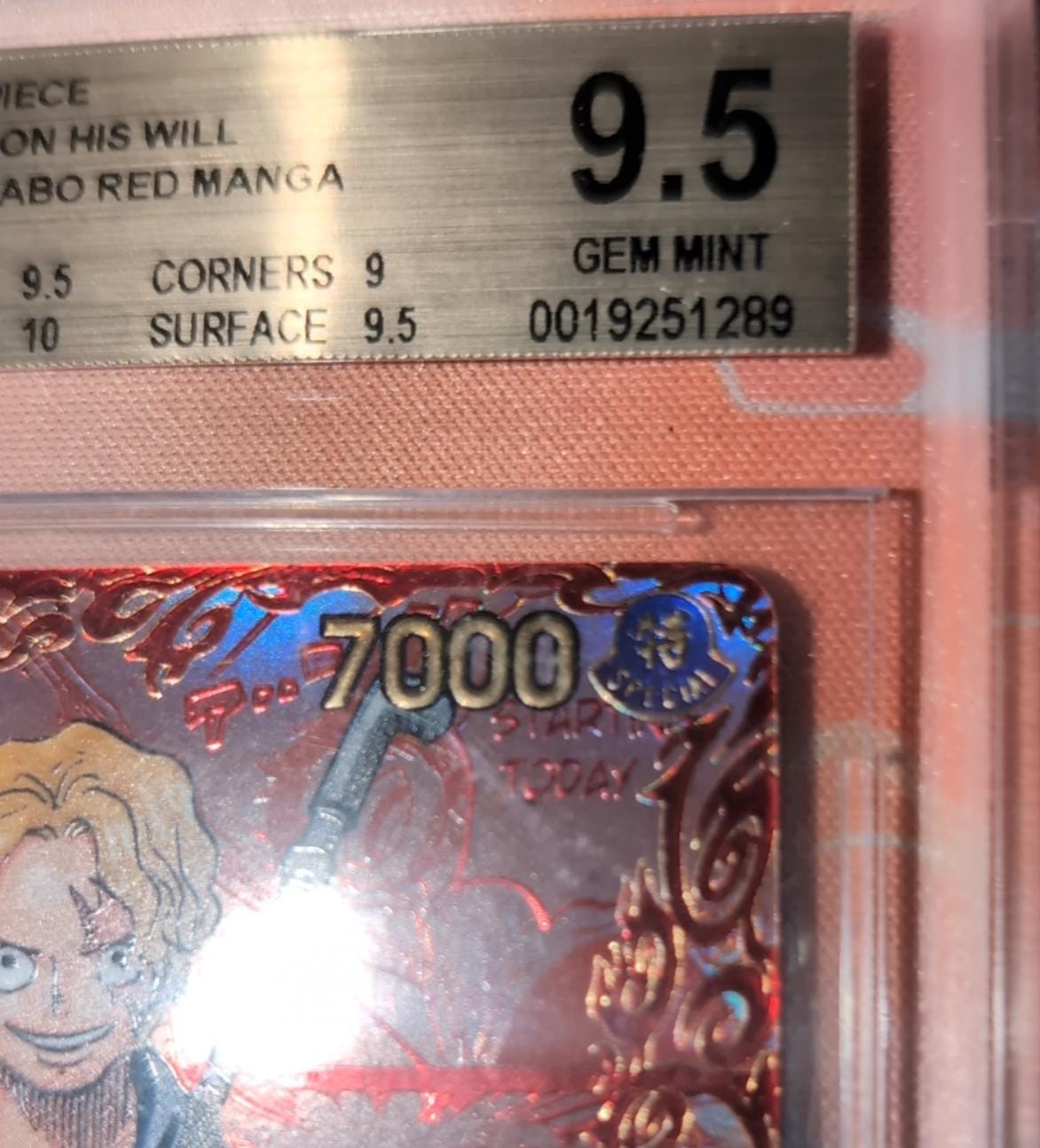 The product is a 2025 One Piece Card Game featuring Sabo from the RED MANGA ART SEC with a BGS 9.5 grade from Beckett Grading Services. This collectable card, part of the One Piece CCG manufactured by Bandai, is considered a speciality SP card with a foil finish. It is a standard-sized card depicting a human creature/monster type in red colour, making it a sought-after item for collectors and fans of the One Piece franchise.