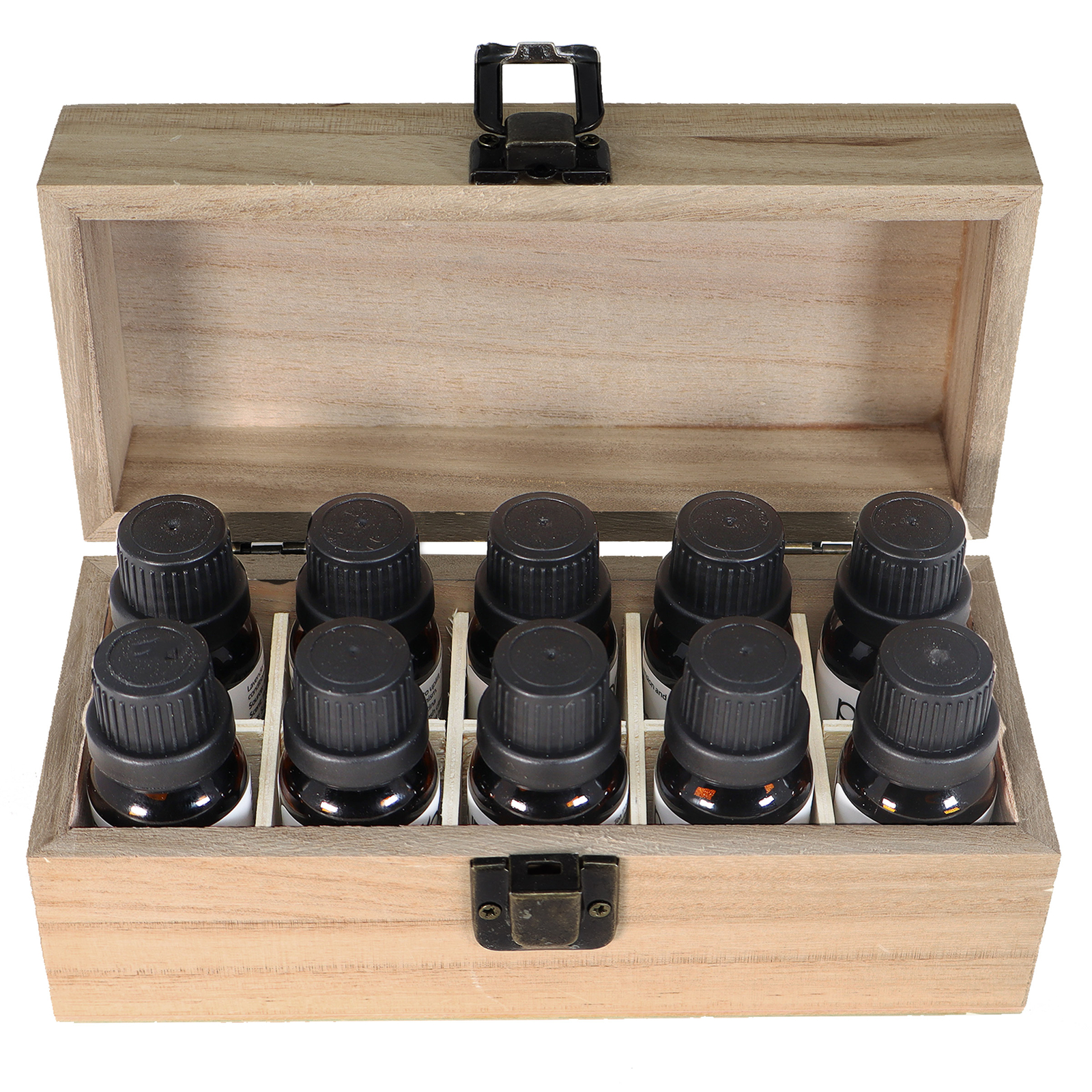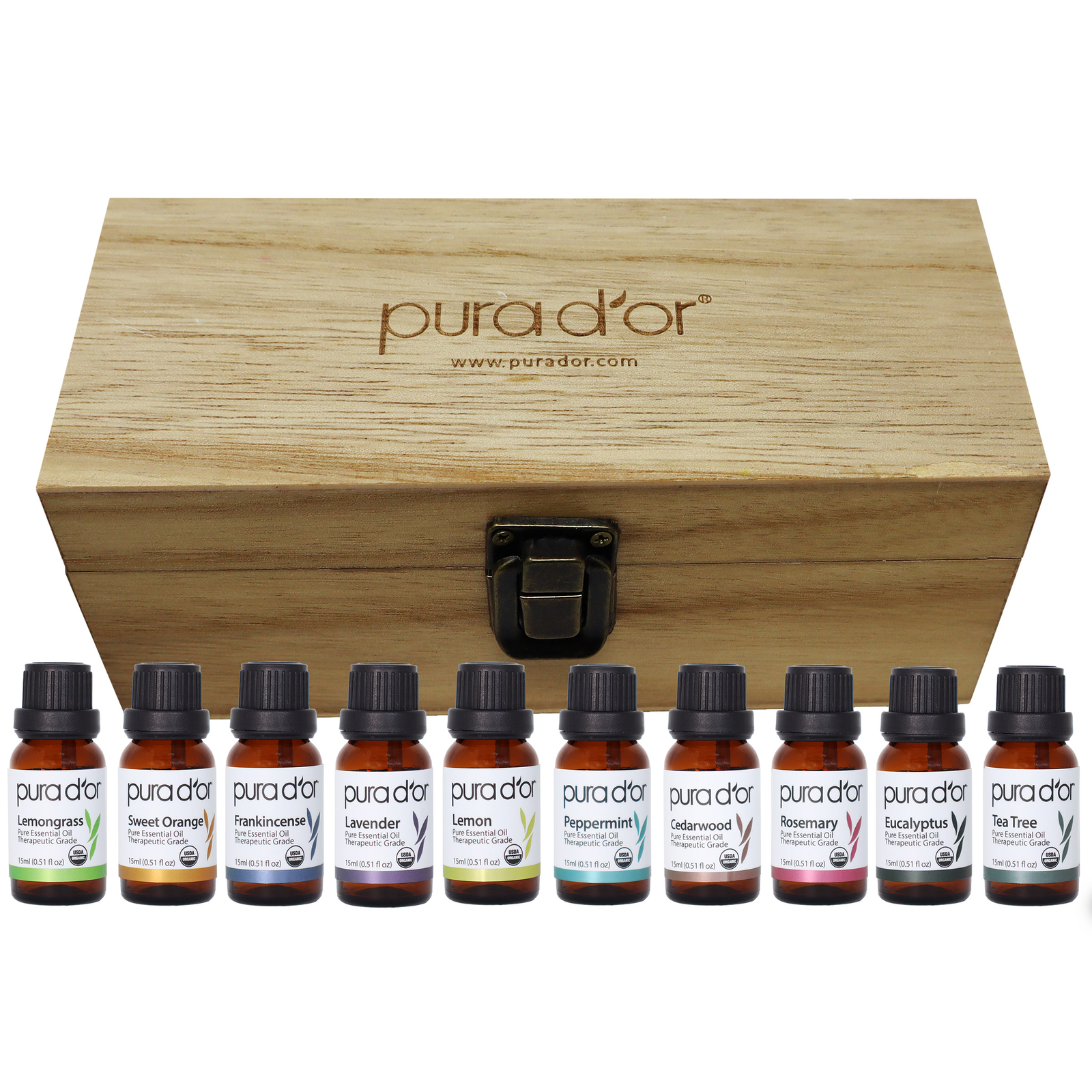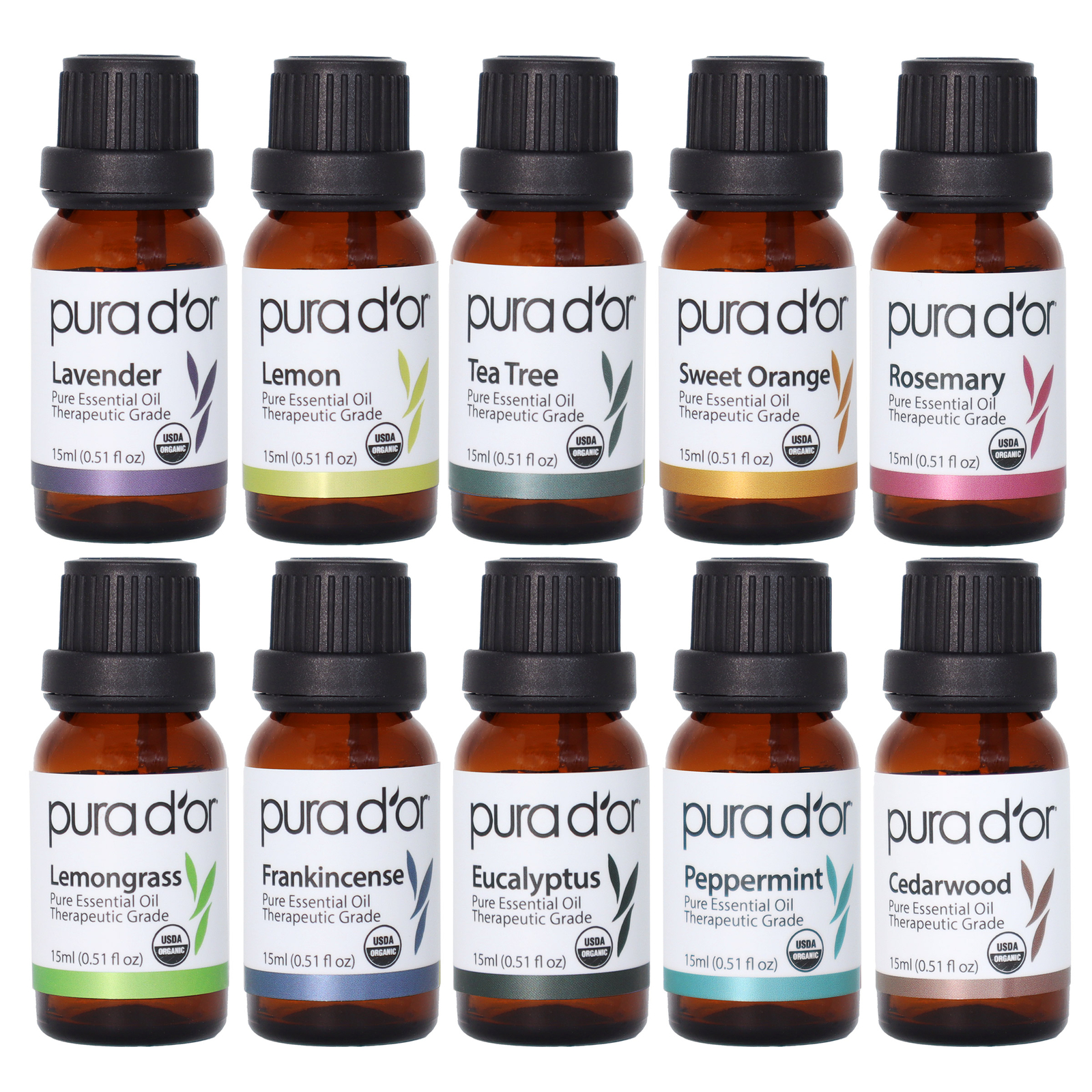 Pura d'or Perfect 10 Essential Oil Set, 5.07 fl oz (10) 0.5 fl oz Bottles Scents: Peppermint, Cedarwood, Rosemary, Eucalyptus, Tea Tree, Lemongrass, Sweet Orange, Frankincense, Lavendar & Lemon Great for Relaxation & Wellness USDA Certified Organic PURA D’OR is driven by desire to provide superior solutions to your toughest beauty and personal care problems. Experience nature and purity in every formula with the combination of select natural ingredients, premium oils, and our naturally-based preservative system. Manufactured in sunny Southern California. PURA D’OR is dedicated in providing sustainable and friendly products that uses renewable energy and recyclable packaging. Perfect 10 Essential Oil Set is made of 100% pure and natural USDA certified organic therapeutic grade quality aromatherapy oils. Essential oils offer a variety of uses from aromatherapy to improving overall wellness, massage therapy or even to just initiate sleep. Essential oils are extracted from root, seed, flower, leaf, or bark of a tree or plant. Because it is pure and natural, it holds powerful and incredibly beneficial compounds. It targets areas of tension, stress, and other issues. Any oil from our essential oil set can be diffused or topically applied (only when diluted) to experience its unique properties or even just to feel connected with nature. This set of aromatherapy oils comes with: • Lavender Oil, • Peppermint Oil • Tea Tree Oil • Lemon Oil • Sweet Orange Oil • Rosemary Oil • Lemongrass Oil • Frankincense Oil • Eucalyptus Oil • Cedarwood Oil