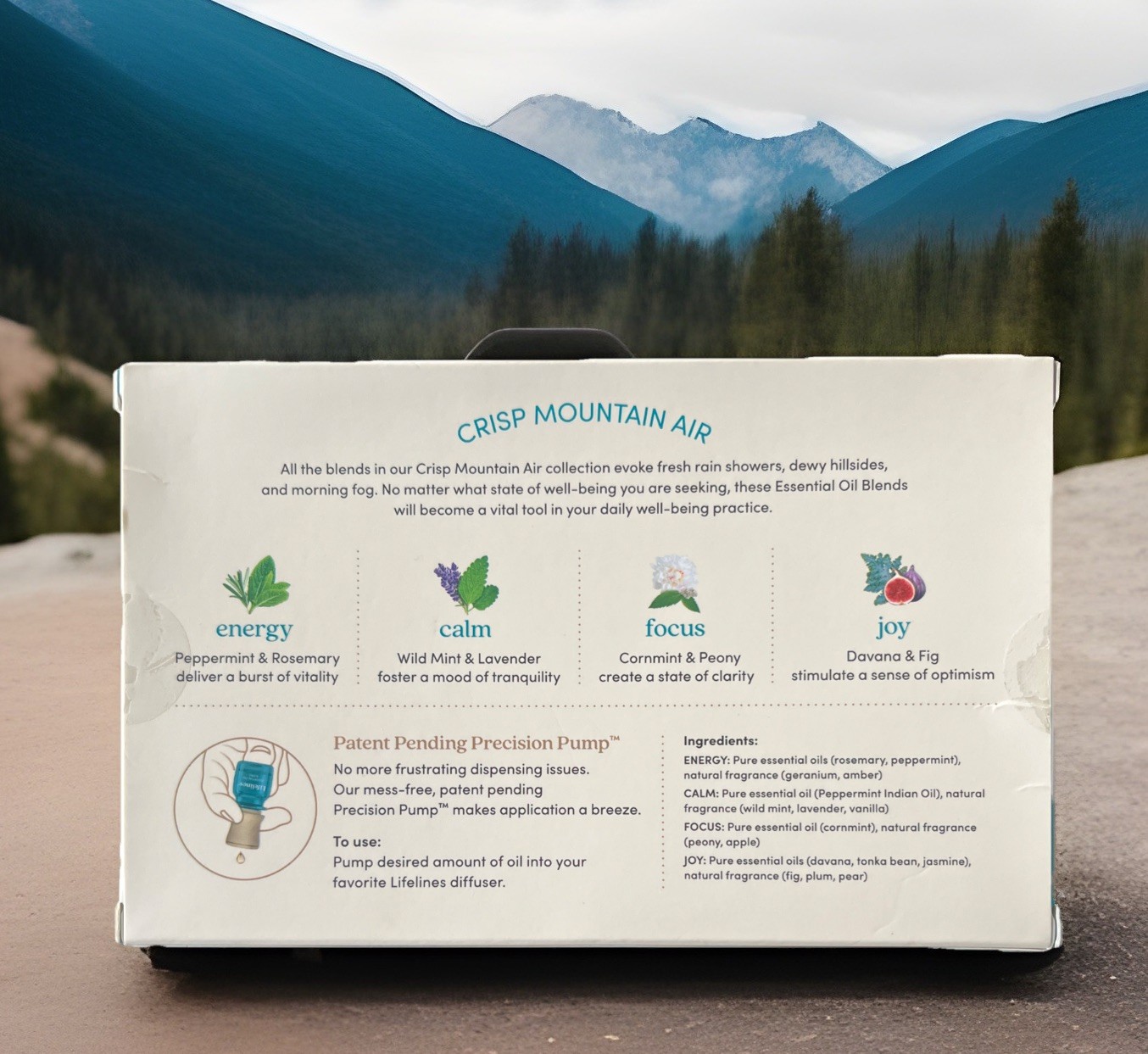 Another aromatic and blissful product from Lifelines - CRISP MOUNTAIN AIR blends of essential oils featuring energy, calm, focus, and joy. Energy - peppermint and grapefruit Calm - spearmint and lavendar Focus - cornmint (sweeter than peppermint, not as sweet as spearmint) and peony Joy - davana (fruity like peaches and apricots) and fig Condition: New • Sealed Ship: fast, safe and cost effective