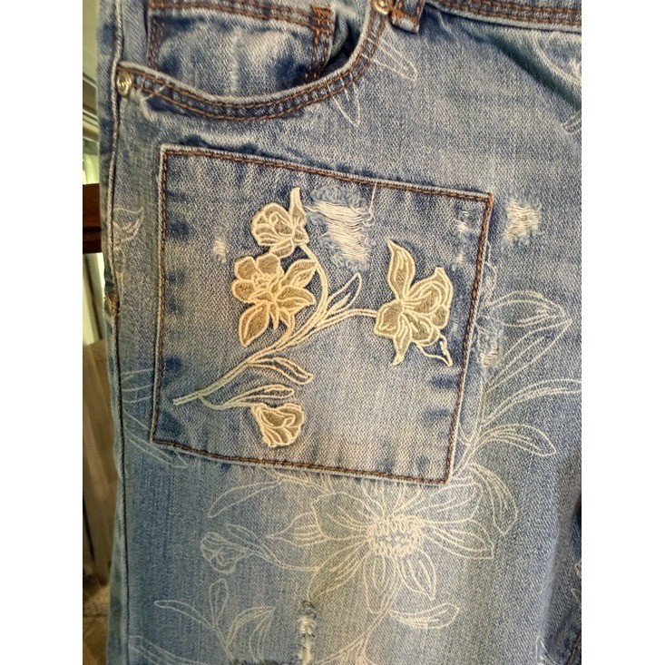 Light wash denim jeans offer a unique, artistic look with all-over white floral line sketches and vibrant embroidered patches. These contemporary-fit pants feature heavy distressing throughout, including frayed holes and raw-edge details, paired with a classic five-pocket design. The back pocket and front thigh showcase intricate floral embroidery in soft cream and pink tones, while the light blue denim has a comfortable, broken-in feel. Perfect for adding a boho-chic or cottagecore touch to your casual wardrobe. Brand: EST. 1946 Denim Style: Distressed Floral Embroidered Jeans Fit: Contemporary Color: Light Wash Blue Pattern: Floral Sketch Features: Embroidered Patches, Heavy Distressing Pockets: 5-Pocket Styling Closure: Zip Fly with Button Material: Cotton Blend Leg: Straight/Tapered Keywords: Cottagecore, Boho, Bohemian, Artsy, Floral, Distressed, Embroidered, Shabby Chic, Summer, Festival, Whimsical, Garden, Casual, Denim, Light Wash