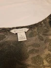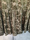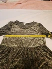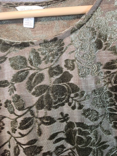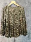 MEASUREMENTS: Chest: 19" Sleeve: 21" Length: (front) 22" Back 26 1/2" This gorgeous EST. 1946 burnout velvet tunic top in olive green features a soft, textured floral velvet pattern that catches the light beautifully. The semi-sheer mesh base gives it dimension, while the velvet overlay provides a rich, elegant sheen. Designed with a tiered peplum hem , balloon sleeves with inset lace trim , and a high–low hemline , this top offers a flattering, flowy silhouette that moves with you. Perfect for holiday gatherings, dinners out, fall events, church, or any outfit that needs a touch of romantic shimmer.