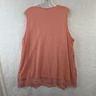 EST. 1946 Tank Top Womens 18/20W Pink Crochet Lace Sheer Lined Tunic Plus Size Previously worn sleeveless tank with light general wear; fabric, mesh, and crochet lace are clean and intact. Scalloped hem, armholes, and neckline are secure with no stains, snags, or holes. Interior EST. 1946 neck, size, and care tags are present; original retail tags are not included. Brand: EST. 1946 Style: Womens plus size sleeveless tunic-length tank top with a relaxed fit and pullover design. Color: Soft pink solid tone with matching lace and mesh overlay. Size: 18/20W (womens plus). Neckline: Classic scoop neck that layers easily under cardigans, jackets, or wraps. Design details: Sheer nylon mesh front and lower hem overlay with ornate floral crochet lace motifs and a scalloped edge for a feminine, dressy look. Construction: Fully lined body for coverage, with the lace and mesh extending below the lining at the hem for a semi-sheer border effect. Back: Smooth solid back with lightweight drape and the same scalloped lace trim continuing around the hem. Material: Front shell 78% cotton and 22% nylon; back shell 100% nylon; lining 100% polyester for soft comfort and structure. Care: Hand wash cold separately, only non-chlorine bleach when needed, line dry, cool iron when needed. Labels and identifiers: Interior neck label reads EST. 1946 with size 18/20W and made in China; inner care tag lists RN37080. Elegant sleeveless lace tank that works well for dressy occasions, office outfits, or layered casual looks with jeans or skirts. 4753