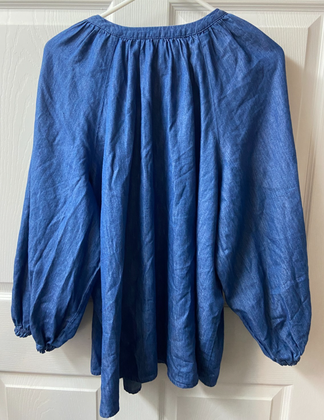 The EST 1948 Top is a boho peasant pirate blouse with a V-neckline and lace-up accents, perfect for the hippie fashion trend. Made from lightweight and breathable chambray fabric, this XL women's blouse features long flared sleeves and a regular fit. Ideal for casual occasions and travel, this blouse can be worn in all seasons and is machine washable for easy care. The blue color and solid pattern add a festive and bohemian touch to this stylish top, making it a versatile addition to any wardrobe. New with tags (6081)