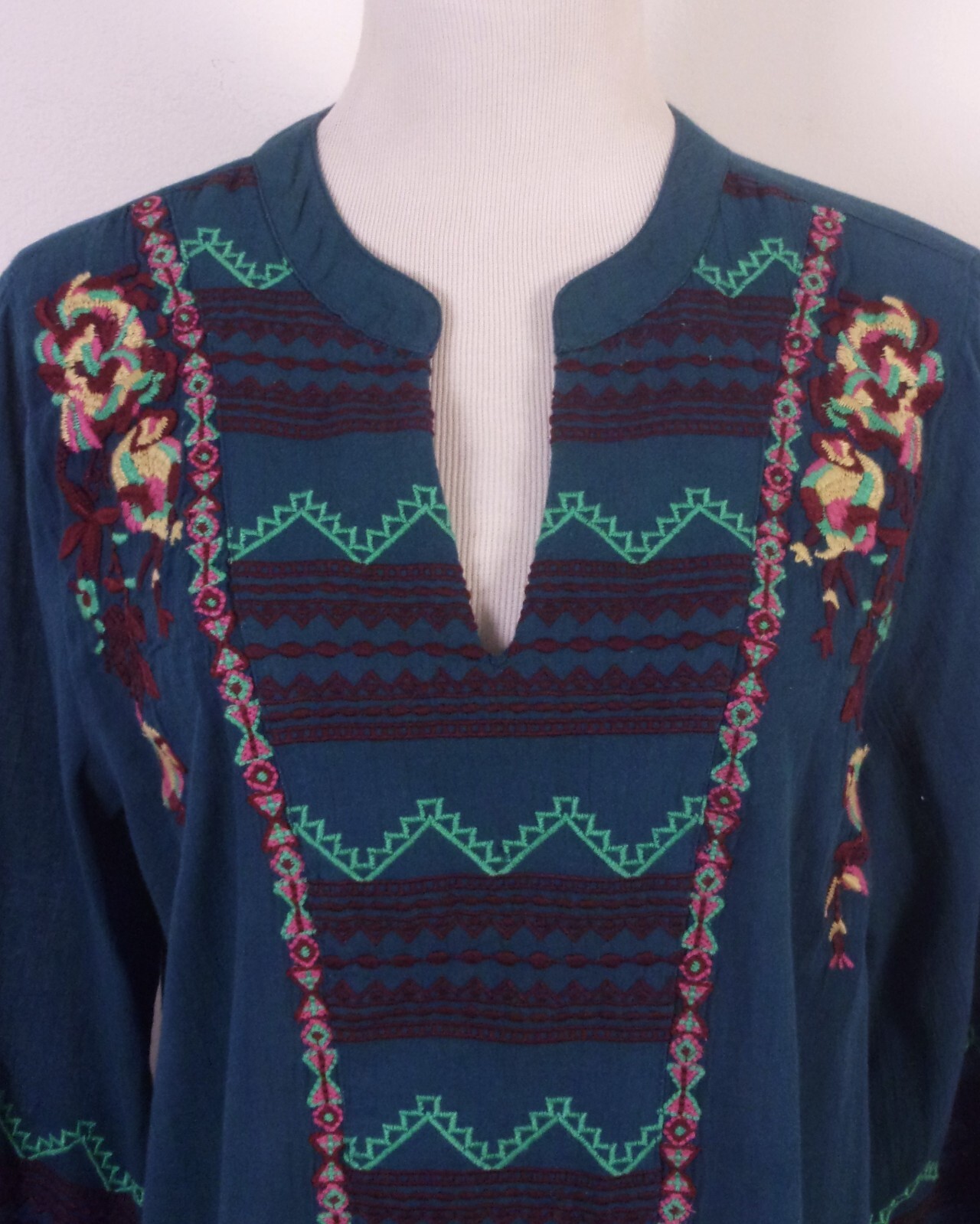 Explore the eclectic charm of the Soft Surroundings Embroidered Tunic Top, a versatile addition to any wardrobe. Fashioned in a dark blue hue with vibrant embroidery, this top encapsulates a blend of classic and bohemian style. The long-sleeved, V-neck design offers a comfortable and flattering fit for a size M, making it an ideal choice for various occasions from casual outings to cocktail parties. Crafted from pure cotton, this blouse promises breathability and ease of care, ensuring it's a practical choice for year-round wear. Whether you're headed to the festival or just enjoying a day out, this tunic's regular fit and pullover closure provide a relaxed yet put-together look that's perfect for any season. Beautiful clean condition with zero flaws or issues.