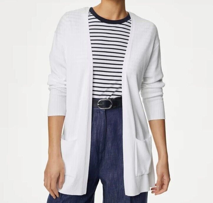 M&S LONG OPEN CARDIGAN AVAILABLE IN BLACK, WHITE & GREY Soft longline cardigan Open Cardi Regular fit Long sleeves Ribbed Two patch pockets at the front This cardigan makes a stylish essential for any wardrobe, perfect to add a layer over any top, blouse or dress. Do not miss out on these amazing Cardis at an unbeatable price! Perfect for you, or to gift! VERY LIMITED STOCK!!! Main: 82% Viscose | 18% Polyamide Machine Washable Regular fit, Ribbed Length Approx: 71cm INSPIRATION: Dress casual with a pair of jeans and trainers. Dress smart with trousers, a shirt/blouse underneath and loafers/pumps. Dress up by pairing some jewellery and a nice pair of heels. OR simply wear as an extra layer Let us know how you dress it! Please Note: Actual colours may vary. This is due to the fact that every computer monitor has a different capability to display colours and that everyone sees these colours differently. SIZE GUIDE APPROX Returns We are more than happy to accept returns. The item must be returned in it's original (new & resell-able) condition with all tags intact. For exchanges, the buyer must cover postage costs unless the item is faulty or damaged. If you would like to return your item please follow the following steps: (1) Contact us via eBay messages to let us know you would like to return your item (2) Make a note inside of the package with your (i) Username (ii) Refund or Exchange. (3) Please make sure the item is sent back via a tracked service as we cannot refund/exchange for items lost in transit. (4) As soon as we receive the item back we will process it within 48 hours. Refunds will be refunded once the return has been processed. Exchanges will be shipped within 2 working days after the return has been processed. Feedback If you are happy with our product and services ,a good review / Feedback would really help grow this business . If you have any issues instead of leaving a negative feedback we would really appreciate if you could let us know so we can rectify the issue straight away. In the meantime you may wish to look at our other products. Thank you for shopping