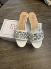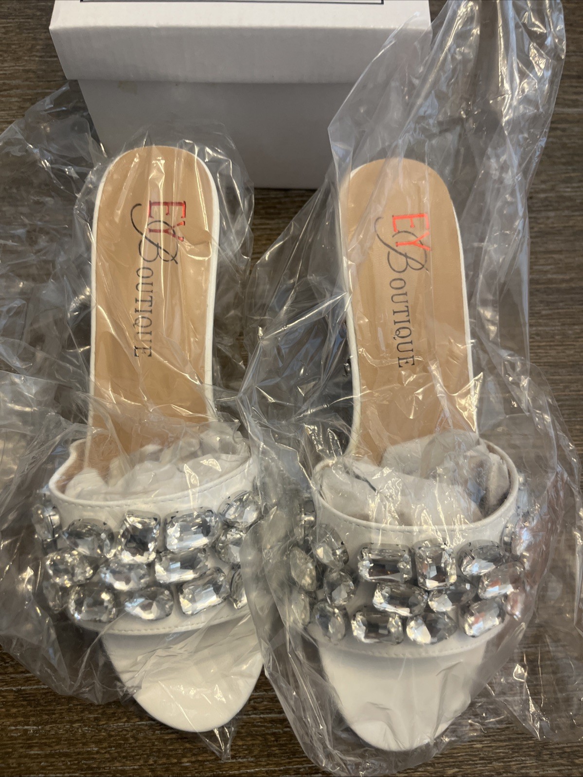 The EY Boutique White Jewel Rhinestone Embellished Shoes are a stunning pair of size 7 heels designed for brides. The shoes feature a white color with intricate rhinestone accents, adding a touch of glamour to the wedding attire. With a block heel style and slide design, these shoes are perfect for summer and spring occasions. Made from synthetic material, these shoes are from the brand EY Boutique and are sure to make a statement at any wedding ceremony.