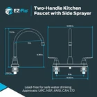 EZ-FLO KITCHEN FAUCET: This EZ-FLO high-arc kitchen faucet is providing a sleek and contemporary look to your kitchen sink; delivers up to 1.8 Gallons Per Minute (GPM) of water for a steady flow and is equipped with a lifetime ceramic disc cartridge, ensuring drip-free performance DESIGN: This kitchen faucet is designed to fit a four-hole sink installation; features a clean and streamlined look with a swivel spout that provides a 180-degree rotation, and a 2-metal-handle mount design that brings a classic touch to any kitchen decor EASY TO USE: This easy-to-use sink faucet with matching side sprayer from EZ-FLO Impressions Collection features aerators that provide continuous refreshing stream while reducing water consumption; Water supply lines are not included DURABLE: This sink faucet is constructed with durable material and stainless steel finish that can withstand corrosion CERTIFIED: These two-handle kitchen faucets are UPC, NSF, ANSI, and CAN 372-approved for product safety and comply with lead-free law