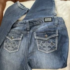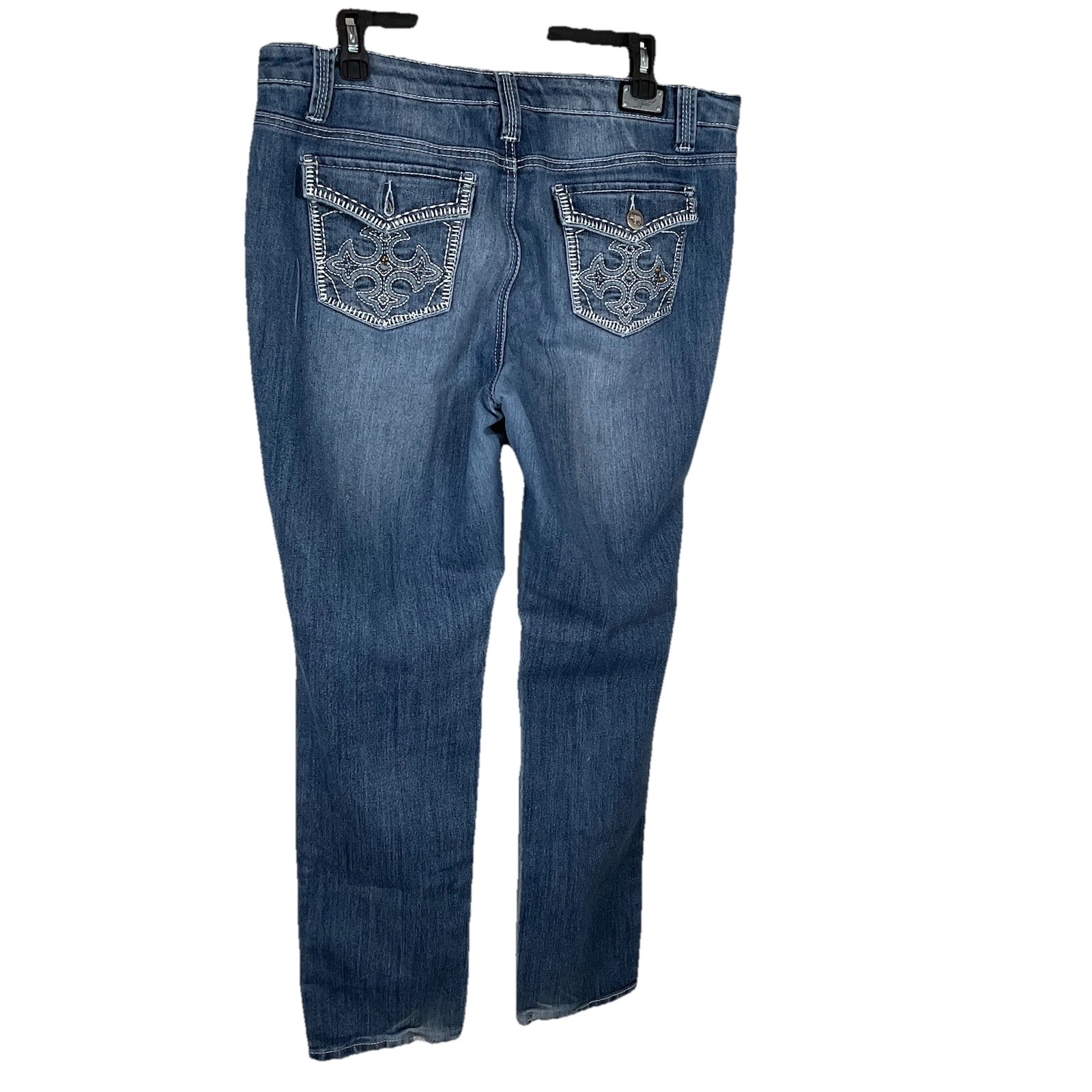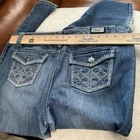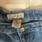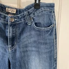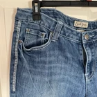 This is a pair of Earl Jeans for women in size 12. The jeans are a solid blue color with thick stitch embroidery and studded accents. They have a cropped style with a mid-rise waist and a 5-pocket design. Made of polyester, spandex, and cotton blend with denim fabric, they feature a zip and button closure. These jeans offer comfort and stretch, perfect for all seasons.