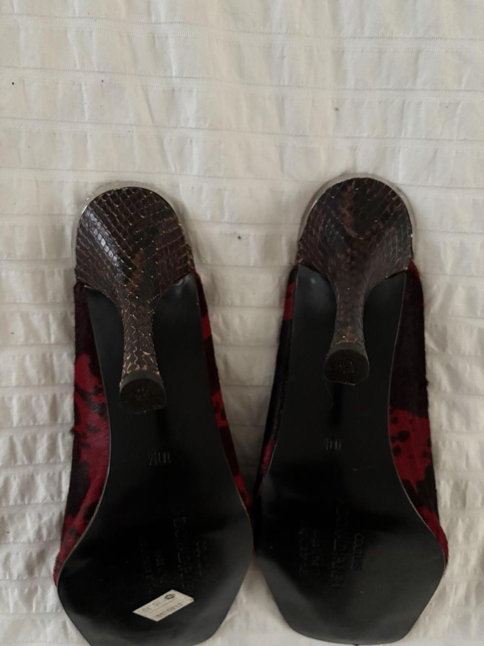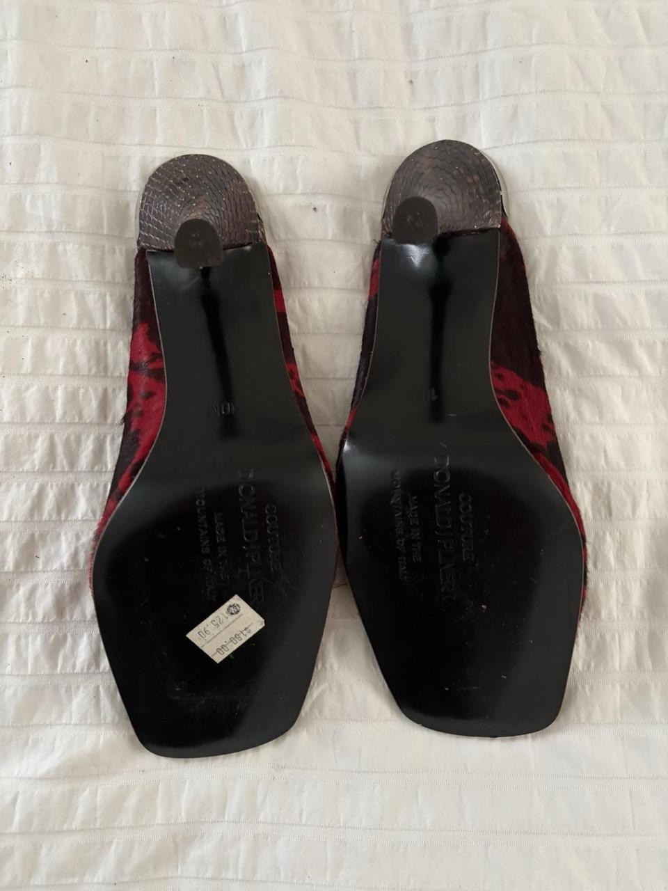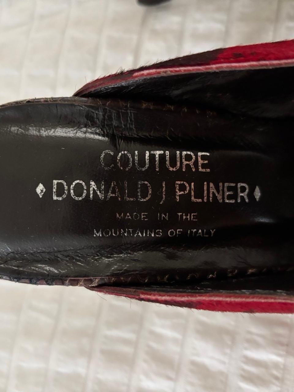 Early 2000s couture Donald J Pliner black and red animal hair texture and print and snake skin heels! Very comfortable!!! Originally worth $180 around 20 years ago. In great condition size 10 but fits like a 9. Measurements. Length 10. Widest width 3 1/2 inches.