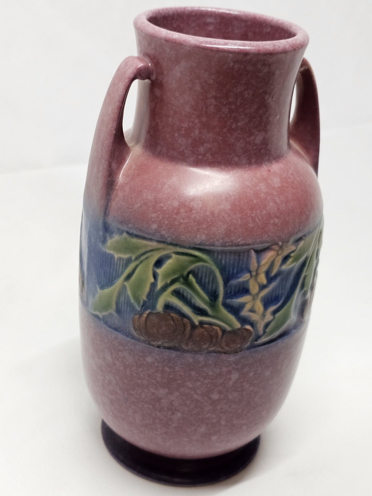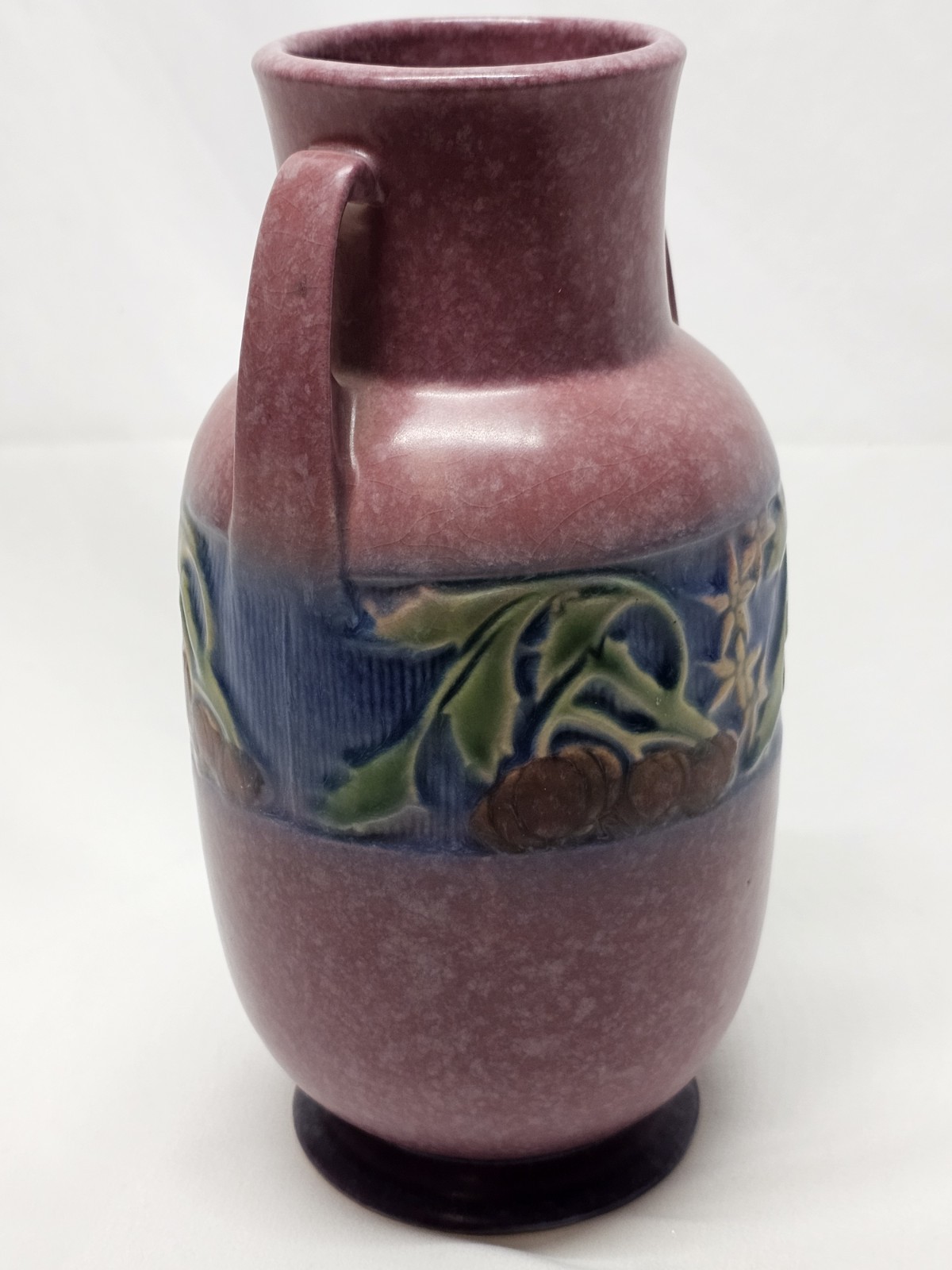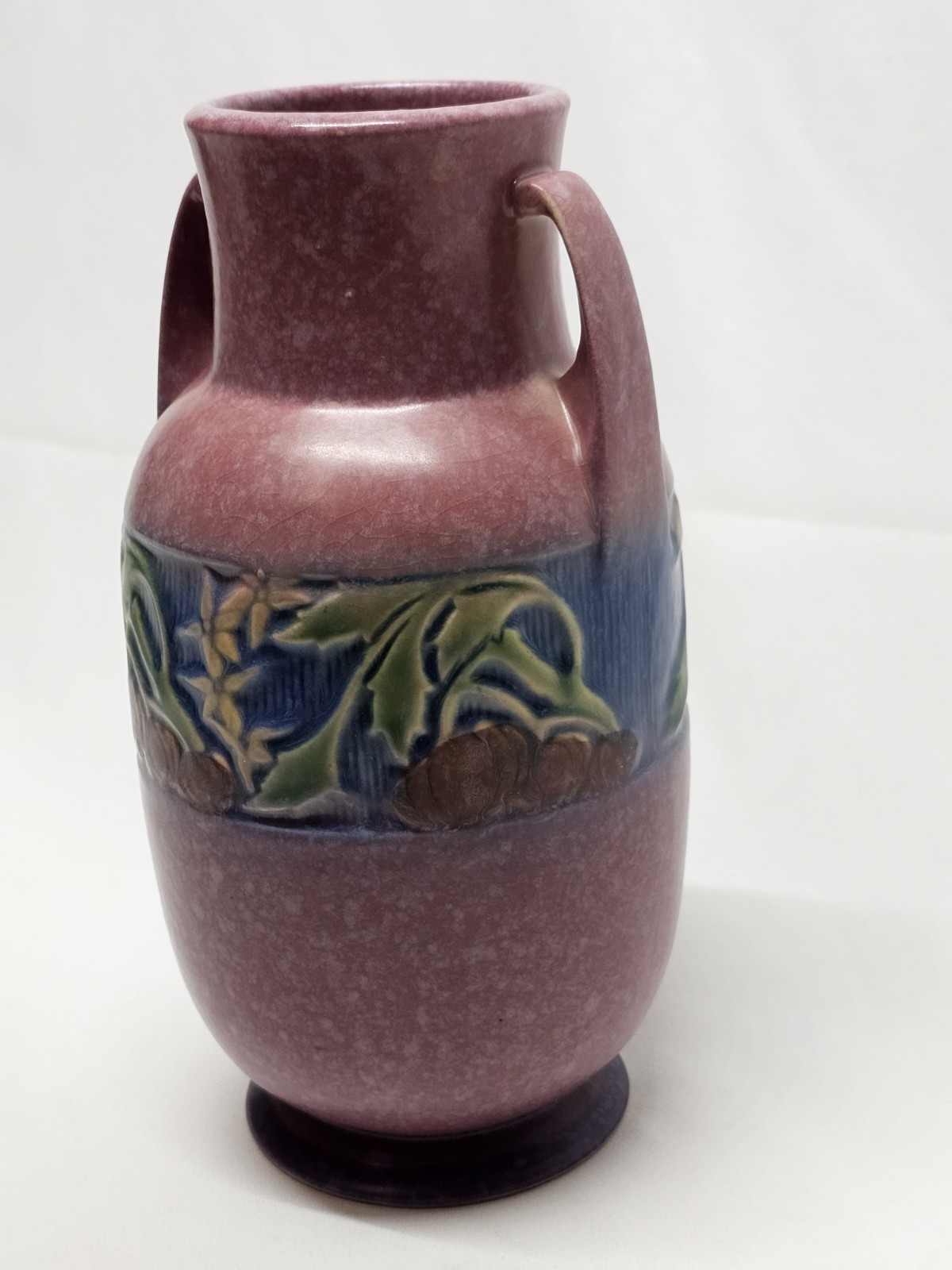 A beautifully rounded 9" Baneda vase, showcasing raised banded fruit and floral detail. Unmarked, but a clear spot where the foil label once was confirms its authenticity. A prized form for collectors.