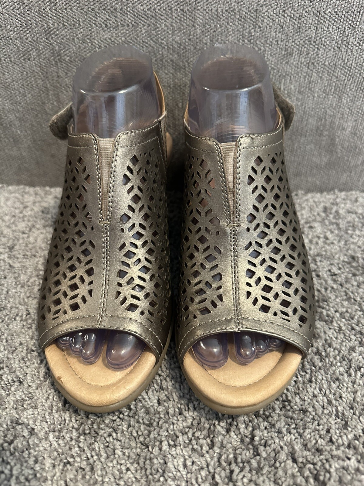 Elevate your shoe collection with these stunning Earth women's wedge sandals in a beautiful gold color. The slingback style and hook & loop closure provide both comfort and style, making them perfect for any occasion, whether it's a casual day out or a party. The mid-height heel and adjustable strap ensure a perfect fit, while the logo accents add a touch of elegance. These sandals are made of high-quality leather and feature a comfortable fabric insole. The Cascade model is designed for women who love metal-themed shoes and want a stylish addition to their wardrobe. They are available in UK shoe size 5.5, US shoe size 7.5, and EU shoe size 38, with a shoe width of M. Make a statement with these stunning sandals and step out in style! Preowned Good Condition