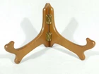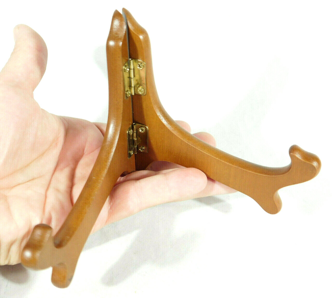Hello, here is a small sized solid Wood folding and or adjustable Easel display stand with gold colored hinges! These are great for Bowls, plates, books or any other items you may want to display. This stand Opened measures around 6 1/2" at its widest and the back is 4 1/8" high by 4 1/2" deep. Please note that this stand does have a lower or short sized back and it will not hold taller pieces. Combine and save on shipping. INTERNATIONAL BUYERS PLEASE NOTE: Import duties and taxes are not included in the item price or the shipping charges. These are the buyers responsibility. If you are concerned about them, please check with your country's customs office before buying RETURN POLICY We guarantee you will be satisfied with your item or we'll refund your purchase price, less shipping charge, upon safe return of the item in original condition within 30 days. Prior to returning the item, please contact us within 48 hours of receiving item. If your item arrives damaged, please contact us within 24 hours of receiving as we will be happy to resolve any issue. Buyer is responsible for all return shipping charges.