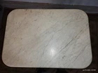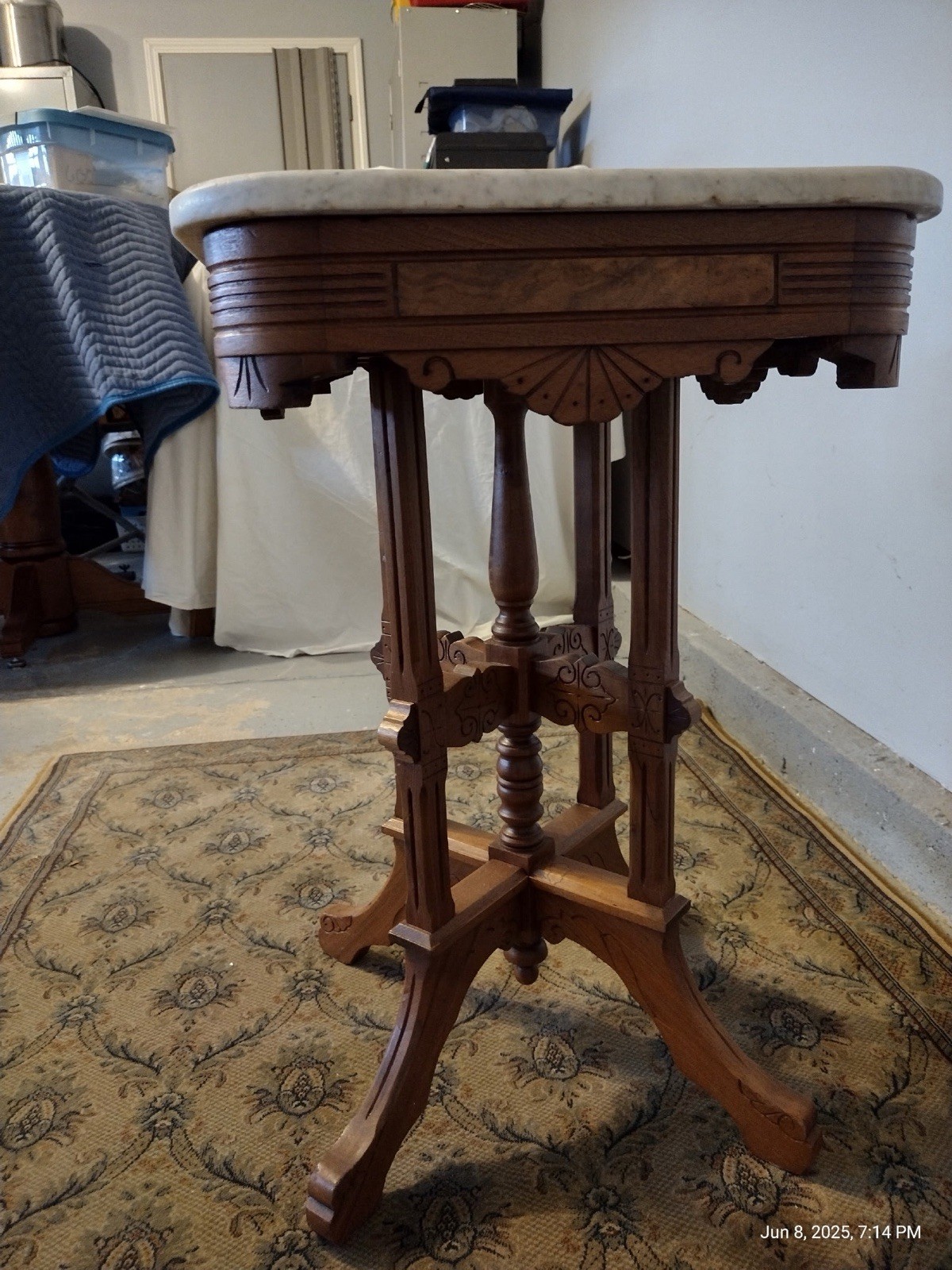Beautifully detailed antique occasional table with marble top that lifts off. The wooden frame has a single pedestal base that splits into four curved legs. The legs and pedestal are intricately carved with decorative motif in Eastlake-style design. Unmarked in excellent condition. 29" High and 24.5" wide and 17" deep Buyer must arrange pickup.