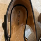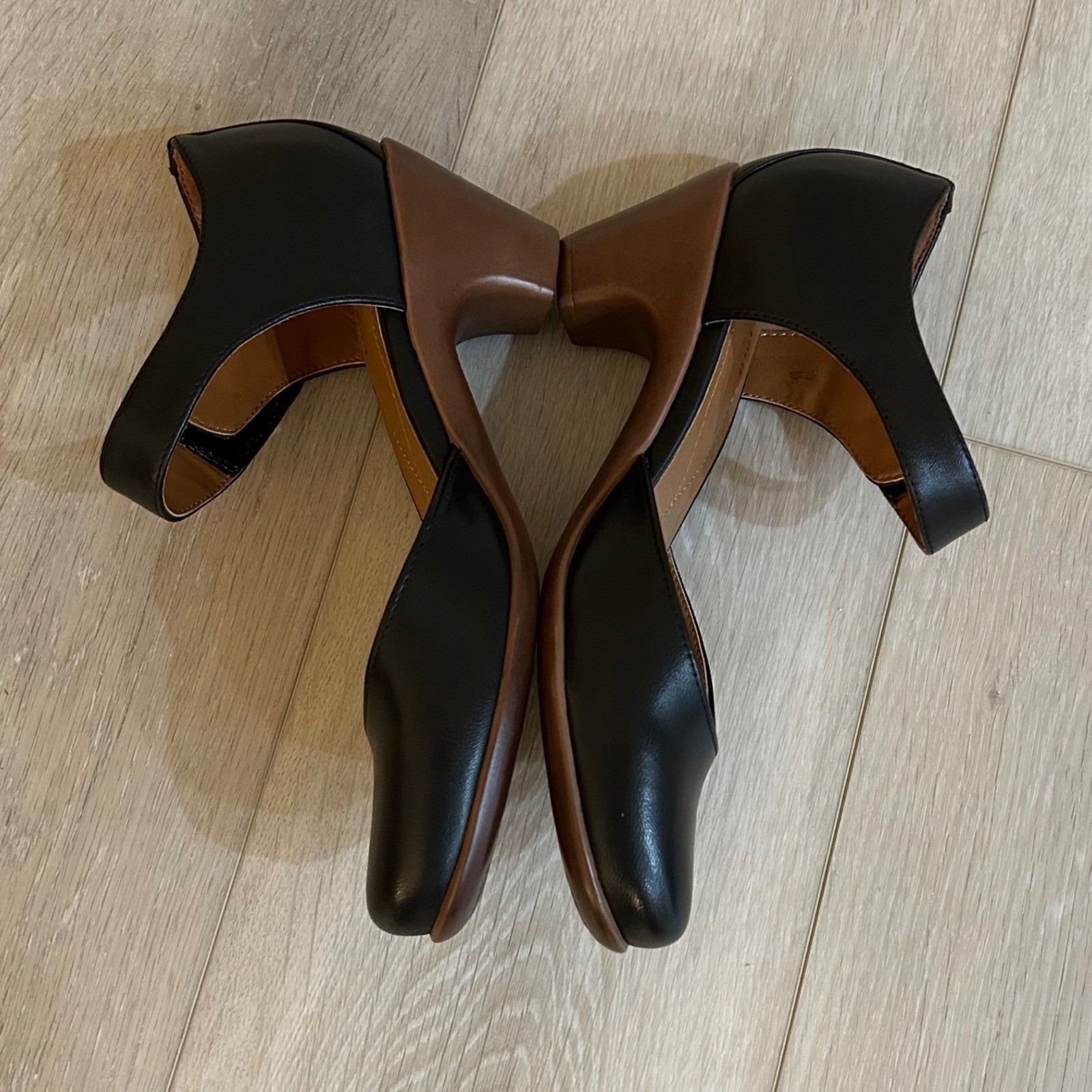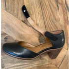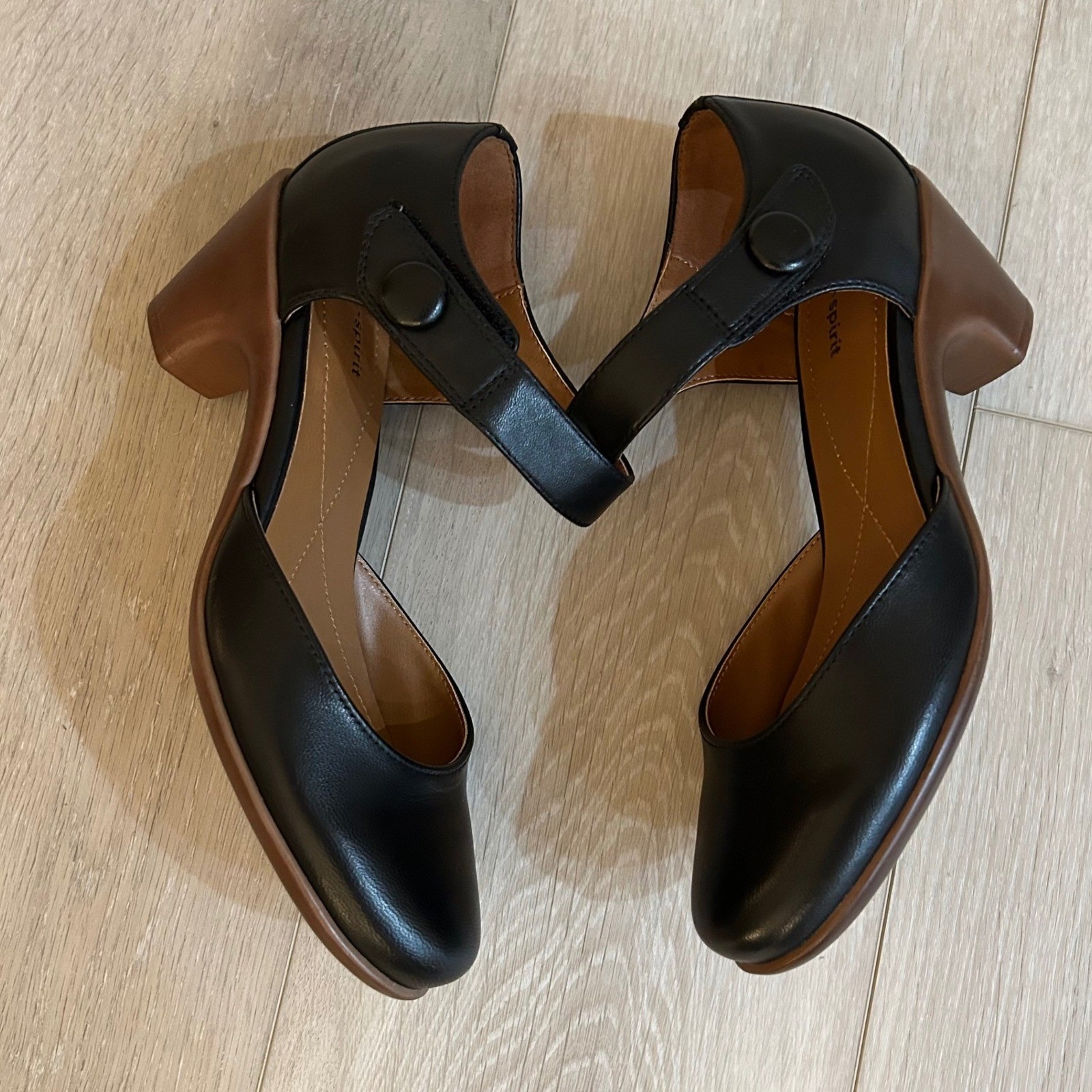 Classic Mary Jane pumps crafted with a smooth black upper and a contrasting brown block heel. These versatile shoes feature a d'Orsay-inspired side cutout and a secure hook-and-loop ankle strap for an adjustable fit. Designed for all-day comfort, the cushioned footbed includes decorative stitching, while the rounded toe provides a timeless silhouette suitable for office wear or casual outings. *minor flaw noted to the bottom of both shoes. Noted in pictures* Brand: Easy Spirit Style: Mary Jane / Pump Color: Black / Brown Material: Synthetic and Leather Upper Heel Type: Block / Chunky Closure: Hook and Loop Ankle Strap Toe Shape: Round Keywords: Dark Academia, Career, Office, Professional, Comfort, Retro, Vintage Style, Mod, Minimalist, Chunky Heel, Comfort, Versatile, Leather