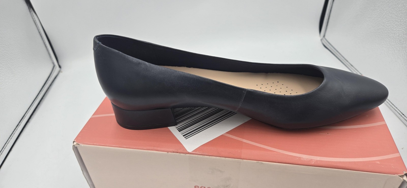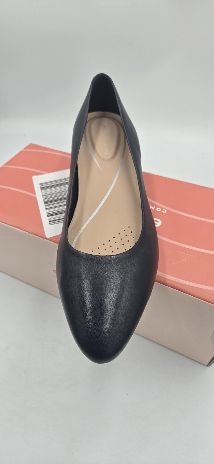 Brand: Easy Spirit Style: seCALDISE low block-heel dress pumps with a classic slip-on silhouette and closed almond toe. Color: Black; solid black upper with matching low block heel and outsole. Size: Womens US 9.5 M (medium width), marked 9.5 on outsole and 9.5M on box label. Materials: Leather upper with smooth finish, soft synthetic lining, and man-made outsole. Design details: Closed almond toe, low sculpted block heel, lightly cushioned perforated insole with Easy Spirit branding and curved metallic accent lines, smooth wrapped heel, and clean topline for a streamlined look. Features: Slip-on pump construction, super lightweight feel, comfort cushioning footbed, ultra flexible sole, and textured rubber outsole designed for traction and all-day wear at the office or for dress occasions. Packaging and identifiers: Comes with original Easy Spirit shoe box featuring comfort branding including super lightweight, comfort cushioning, and ultra flexible messaging. Box side label information includes style name seCALDISE, size 9.5M, color code MCY, BOL 16619365, ID F984236, code L 590, and SS 0893. UPC on barcode label: 191656340647; additional box code printed as UPC: 0000191656340647; additional barcode number: 00001318291752.