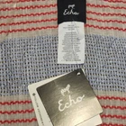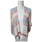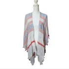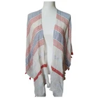 Echo Design New York NWT $129 Stripe Tassel Ruana Poncho Shawl, One Size Off White base with light blue, redish/orange and blue metallic stripes. Tassels on the sides, frayed hem. 67% cotton, 31% Rayon, 2% metallic Brand New with tags. May have a few loose gaping threads as they are knitted. Smoke and pet free. Approximate measurements laying flat- Side to side-37.5" Shoulder to hem-Front-28", back-43"