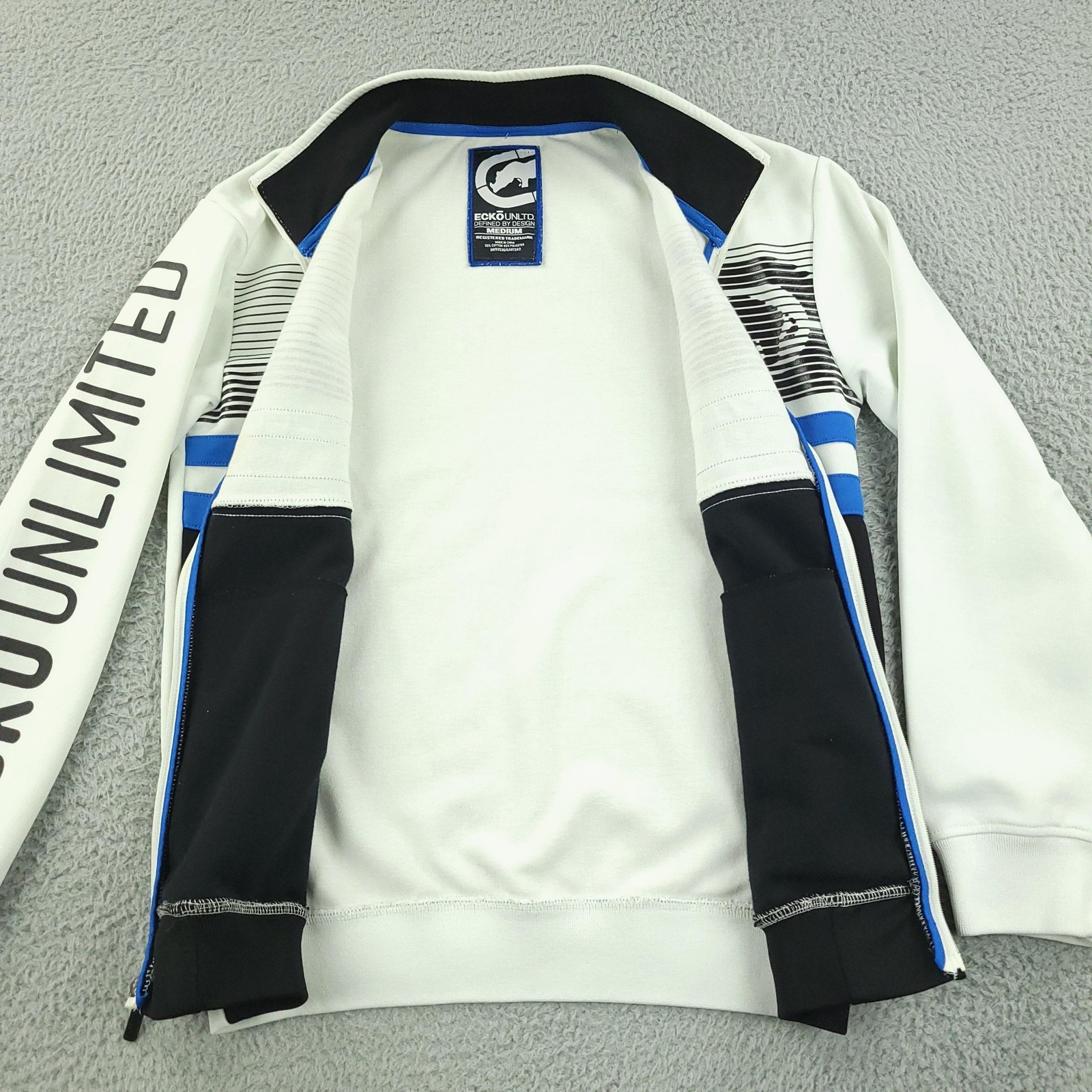 Ecko Unltd Jacket Mens Medium White Black Blue Full Zip Track Hip Hop Logo Style Condition: Gently worn Features bold Ecko Unlimited spell out on the left sleeve, line graphic print with Ecko rhinoceros logo on the chest, and two front hand pockets. Blue and white racing stripes across the front and sleeves for an athletic look. Full front zip closure with branded Ecko Unltd zipper pull and stand collar for a classic track jacket silhouette. Main colors are white (upper and sleeves) with black (lower), accented by blue and white stripes and printed logos. Made of 55% cotton and 45% polyester for a smooth and comfortable feel. Official Ecko Unltd "Defined By Design" label inside. Size: Medium (Mens) Back features patch logo at collar for authentic style. Hand pockets for functionality and style. Lightweight and perfect for layering in streetwear, casual, or athleisure outfits. Made in China Measurements are included in the photos, compare measurements with your item to ensure proper fit. (Measurements are done with the item lying flat). I ship next business day and all items include tracking. Items are added daily to my store Visit My Store Buy More & Save! Combined shipping for US customers - $1.99 for each additional item (Add items to shopping cart and discounts will automatically calculate during checkout)