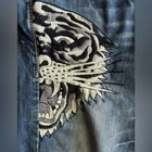 Ed Hardy Jeans Men’s Size 40 X 32 Button Fly Embroidered Tiger Y2K Vintage Super cool vintage Ed Hardy jeans with distinctive tiger embroidery on the sides. Embroidery has some loose threads from wash and wear and have some raggedness at the bottom hem. These jeans have been washed to ensure they arrive in your home fresh and clean. I consider serious reasonable offers. This item ships from the Midwest.