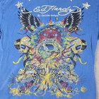 Ed Hardy Polo Shirt Mens 3XL, Pit to Pit 26", Shoulder to Hem 30" Blue Christian Audigier Tattoo Style All Over Print Good Condition, Slight Fade