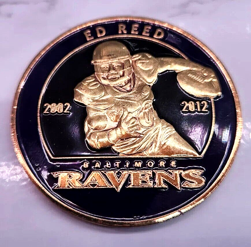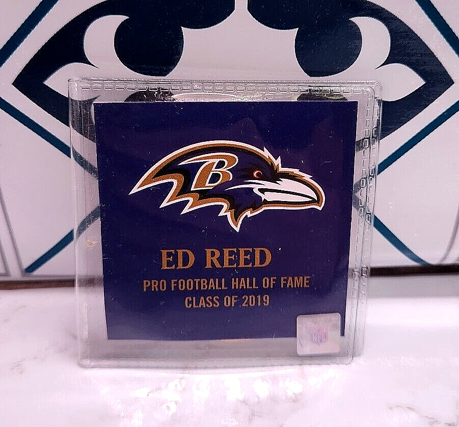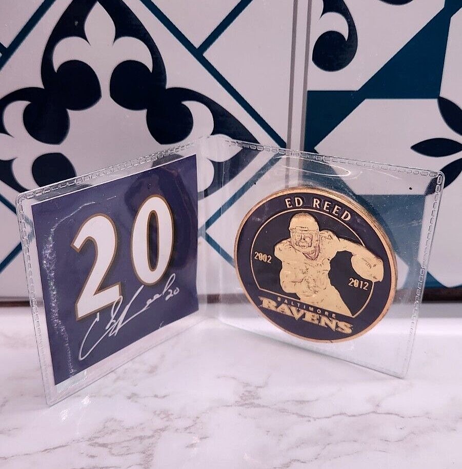 Celebrate the induction of Ed Reed into the Pro Football Hall of Fame with this limited edition Baltimore Ravens commemorative coin! This beautiful collectible features the legendary safety's name, number and the Hall of Fame Class of 2019 logo on the front. The back showcases a stunning image of Reed in action and the official NFL shield. This particular coin was produced to honor Reed during the halftime ceremony of the Baltimore Ravens vs. New England Patriots game on November 3, 2019. It is an officially licensed product of the NFL and is sure to become a prized possession for any Baltimore Ravens or Ed Reed fan. Crafted with exquisite detail and precision, this coin is made from durable metal and finished in gleaming gold tone alloy. It measures approximately 2 inches in diameter and comes housed in a protective acrylic case, making it the perfect addition to any collection. Don't miss your chance to own a piece of football history! Get your Ed Reed #20 Baltimore Ravens NFL Hall of Fame Class of 2019 Commemorative Coin today.