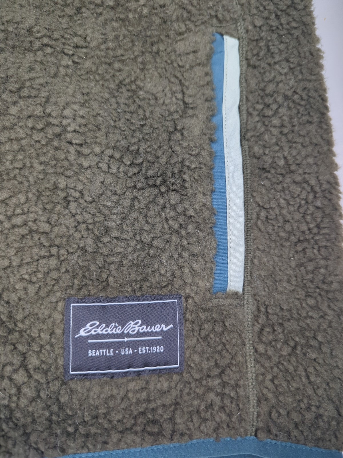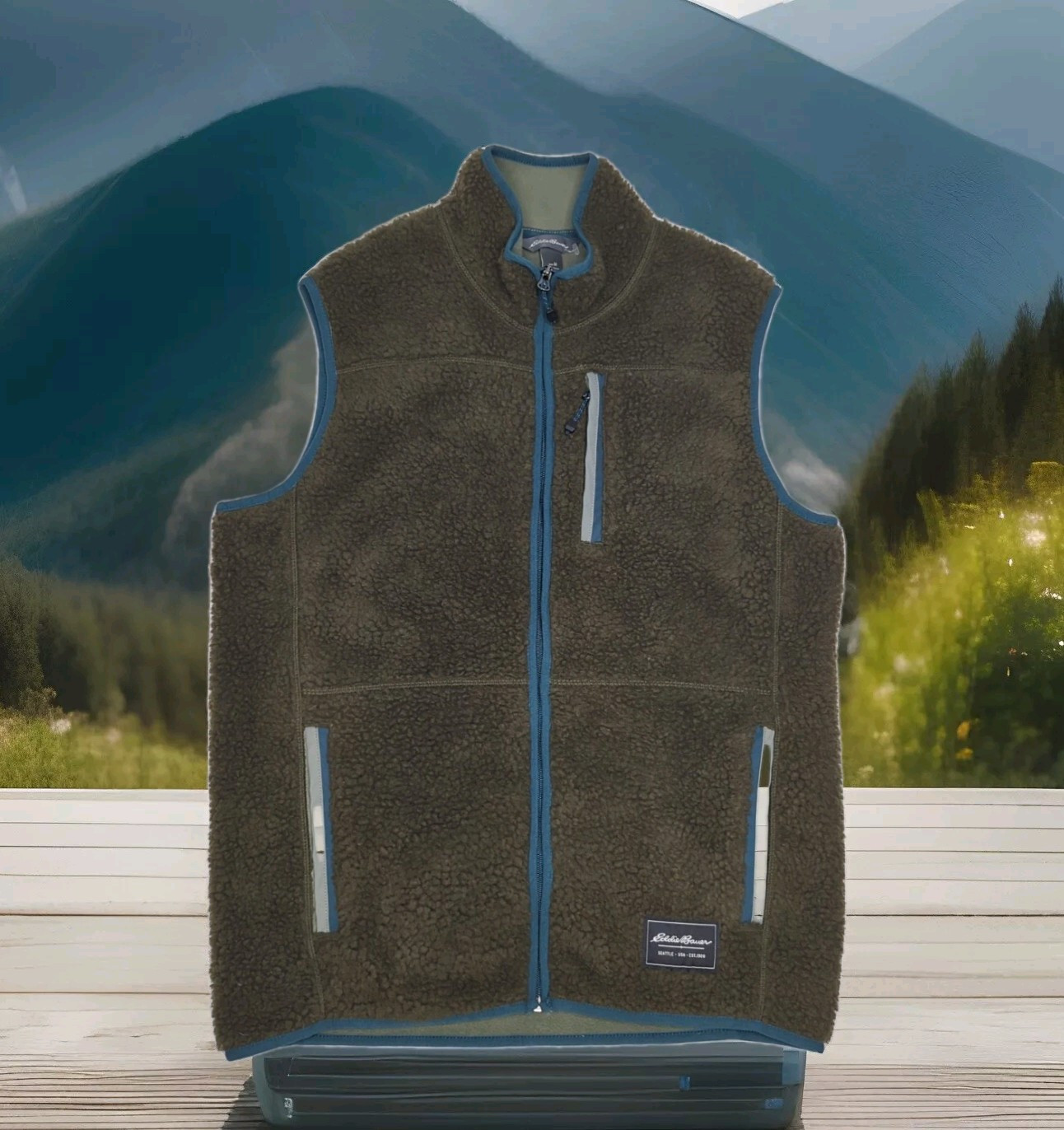 EDDIE BAUER Men's Chilali Faux Shearling Fleece Vest $119 MSRP MENS SIZE MEDIUM – 22” ACROSS CHEST LAID FLAT DARK GREEN-ISH BROWN IN COLOR Soft faux shearling fleece makes this full-zip vest ideal as an insulating layer in cold weather and an outer layer in milder conditions. Plenty of pockets give you storage for all of your on-the-go essentials. Faux Shearling An important note on the use of a culturally appropriated term in this product description: Eddie Bauer has replaced the term Sherpa with Faux Shearling as part of our company-wide effort to remove culturally appropriated designs, terms, and names from current and future products. Sherpa refers to an indigenous people native to Tibet and Nepal in the eastern Himalayas of Central Asia. FEATURES · Secure zip chest pocket · Open hand pockets · Full zip front · Cozy faux shearling lining · Mock neckline · Length: 28.5" · Classic. A universal fit. Not too slim, not too relaxed on body.