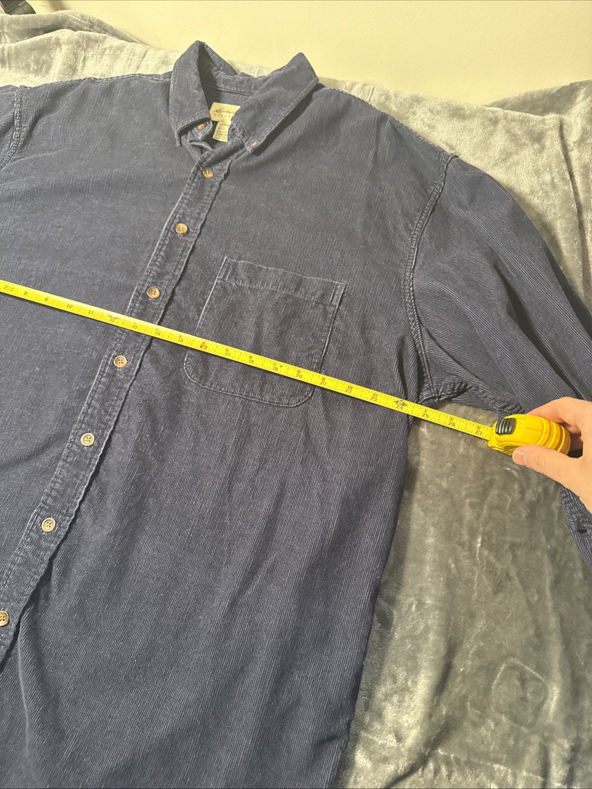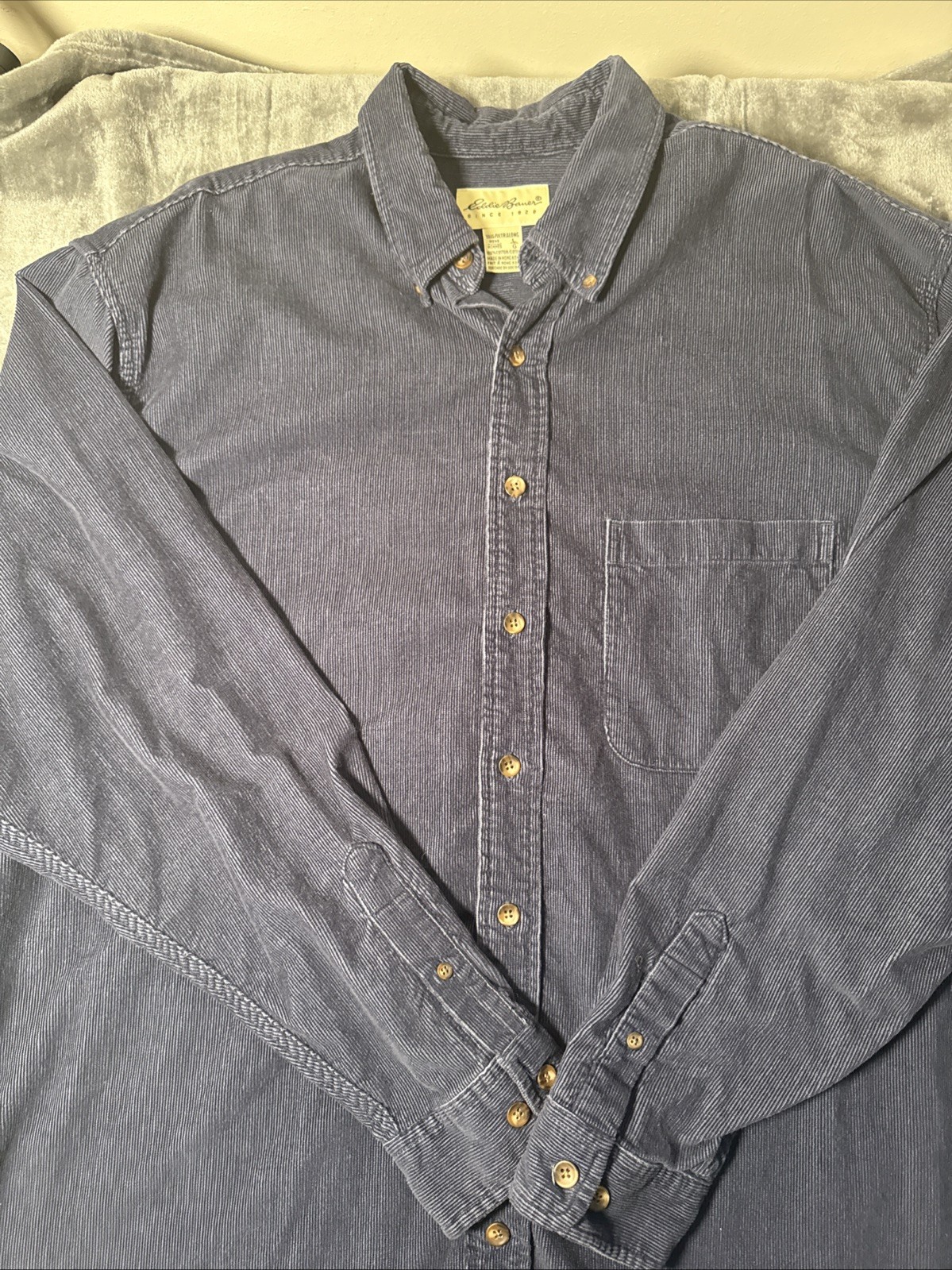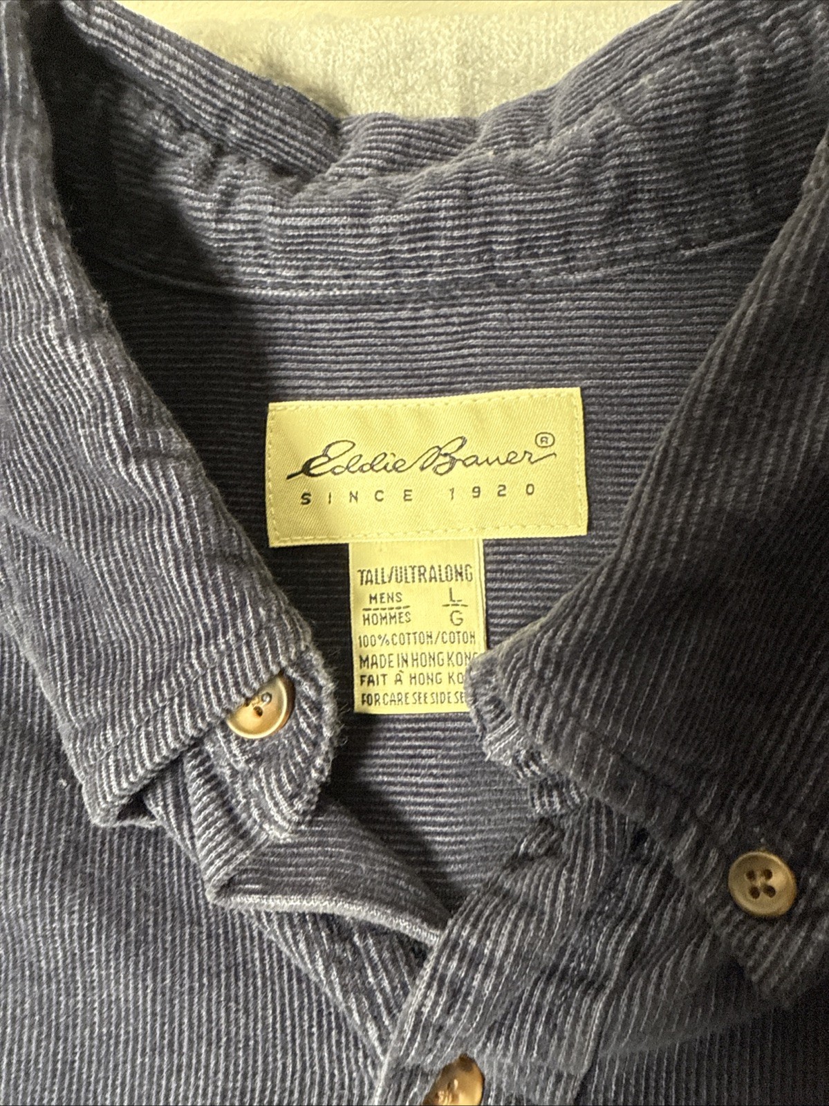 Mens Large Tall Pre Owned- Good Condition Fast Free Shipping!! Trusted Seller The Eddie Bauer Corduroy Shirt is a vintage retro button-down featuring a solid blue color, perfect for a casual occasion. Made of cotton corduroy fabric, this long sleeve shirt has a collared neckline and button closure. With a hint of cowboy and fisherman styles, this shirt is ideal for outdoor activities in all seasons, making it a versatile addition to any wardrobe. Perfect for men looking for a classic and comfortable button-up shirt with a touch of nostalgia.