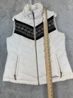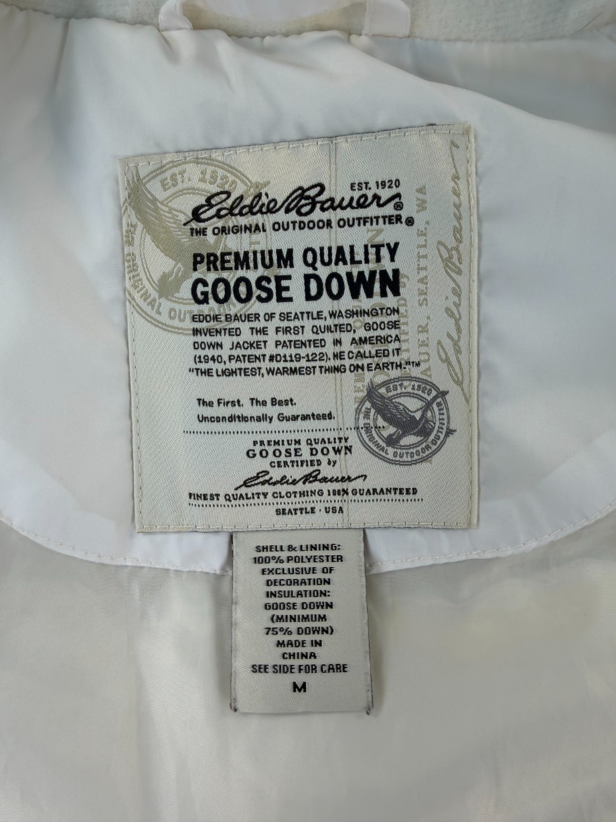Eddie Bauer Premium Goose Down Vest • Size: Women’s Medium • Shell & Lining: 100% Polyester • Insulation: Premium Goose Down (minimum 75% down) • White with black Fair Isle chevron knit panel across chest • Full front zip with stand collar • Two zippered hand pockets • Warm, lightweight, and compressible — perfect for layering or travel Condition: Good preowned condition. Light marks near zipper and side seams — see close-up photos for details. No rips, stains, or down leakage. Clean and cozy overall. See included photos for measurements. 💛 Thanks for supporting our small family business!