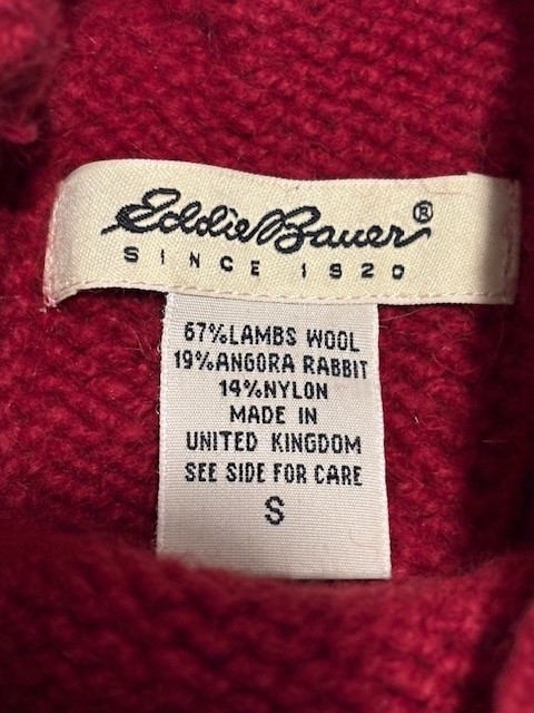 The Eddie Bauer Lamb's Wool/Angora Red Turtleneck in size S is a cozy and stylish sweater designed for women. Made from wool, this pullover sweater features a long sleeve and a turtleneck neckline, making it perfect for the winter season. The solid red color adds a touch of warmth and vibrancy to the outfit, while the high-quality material from Eddie Bauer ensures durability and comfort. Ideal for those looking for a classic and versatile piece to add to their winter wardrobe.