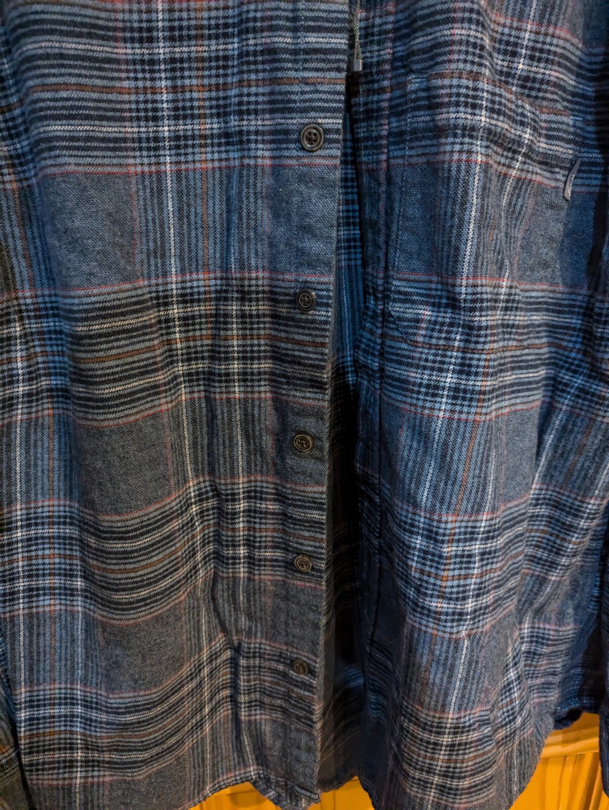 This Eddie Bauer flannel shirt is a men's XL size button-up with a collared neckline. Made of cotton flannel in a multicolor plaid pattern, it features a button-down collar and long sleeves. Ideal for winter and fall, it is suitable for travel, casual outings, or workwear. The shirt has pockets and is machine washable, with a classic outdoor theme.