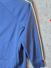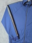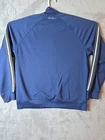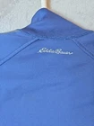 This Eddie Bauer jacket is a men's varsity-style jacket in size L, featuring a blue striped design with embroidered logos. Made of softshell polyester fabric, it is suitable for casual wear during the winter, fall, and spring seasons. The jacket has a zip closure, pockets, and a long length, ideal for running, track activities, or gym training. The jacket's performance and activity theme is geared towards a sporty and active lifestyle.
