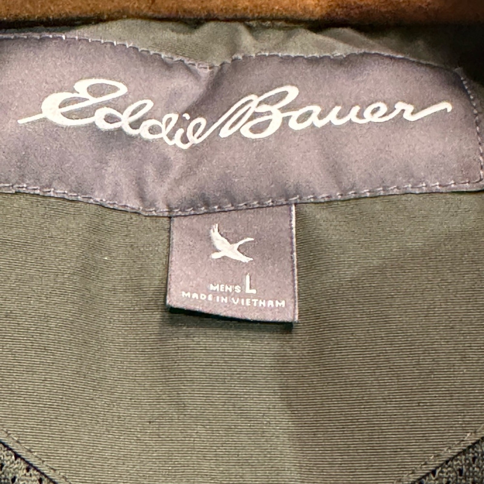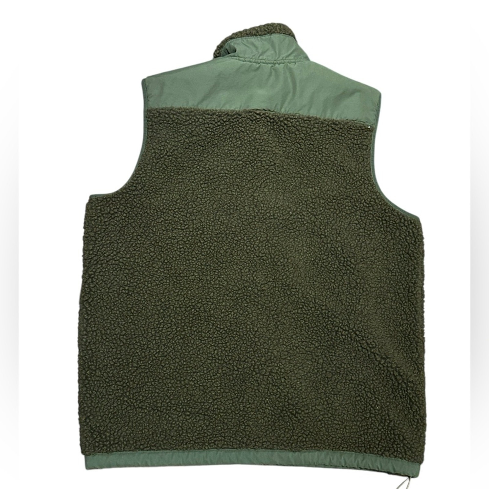 This is a super cool men’s size large vest by Eddie Bauer. This is a green fleece full zip vest with standing collar and it’s an excellent gently used condition.