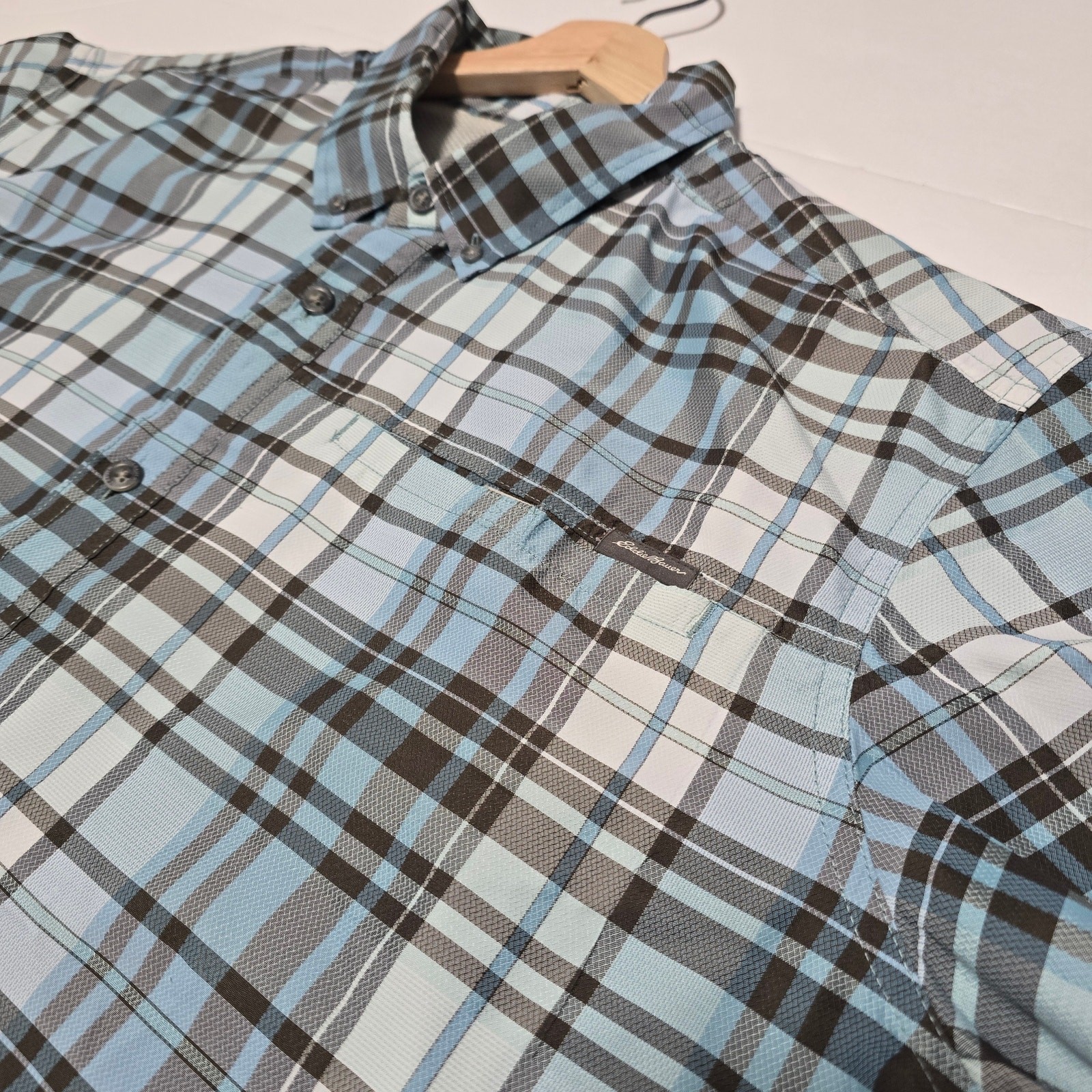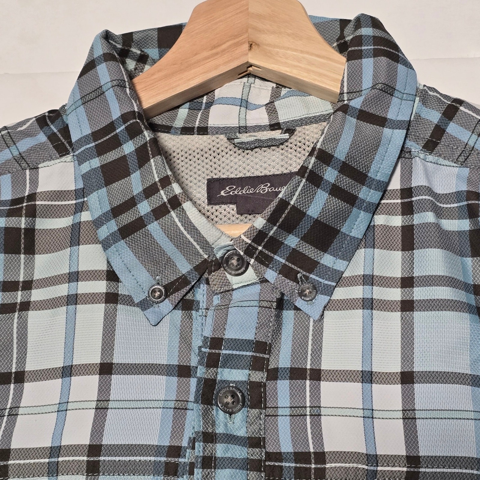 Eddie Bauer Short Sleeve Blue Button Down Outdoor Shirt Size XL Lightweight & Packable for Outdoor Fishing or Hiking Activities Plaid Blue Gray and White Flat Measurements: pit to pit: 25" Length: 29"