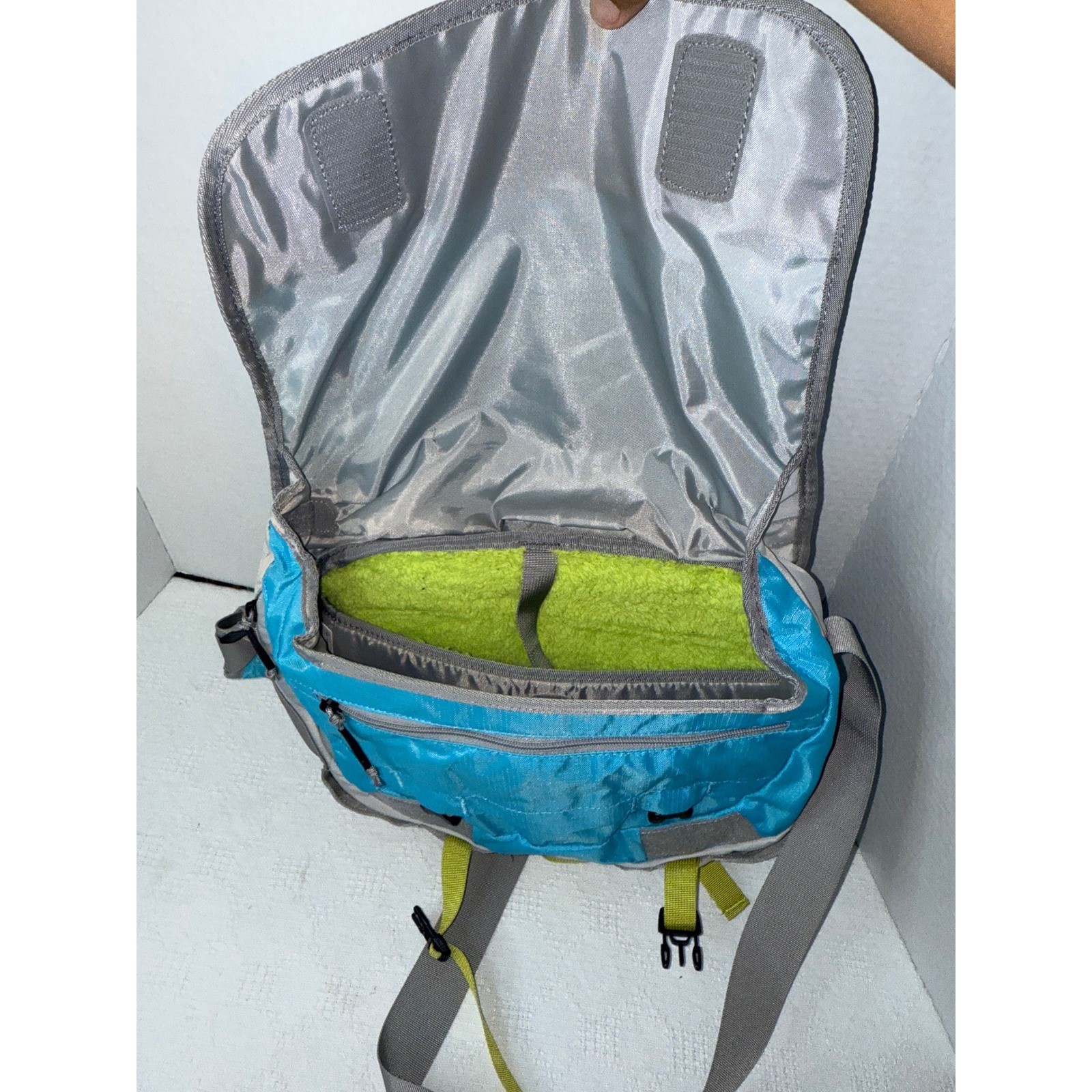 A vibrant pop of color for your everyday adventures! This stylish Eddie Bauer messenger bag is designed for versatility and convenience, providing ample space and organization for your daily essentials. Sporting a vibrant blue hue complemented by grey accents and playful chartreuse straps, this bag features a secure flap closure with buckle straps, a comfortable adjustable shoulder strap, and reflective detailing for added visibility. Inside, you'll discover a spacious main compartment perfect for carrying books, a laptop, or other larger items, along with multiple pockets for keeping smaller items organized. It's the perfect companion for your daily commute, weekend explorations, or casual travel. Material: Nylon, Polyester Style: Messenger Bag Department: Unisex Adults Color: Blue Lining Material: Fabric Features: Adjustable Strap, Inner Pockets, Outer Pockets, Reflective, Padded Handle/Strap Material: Nylon Character: Blue, Traveler, Adventurer, 12x10 K